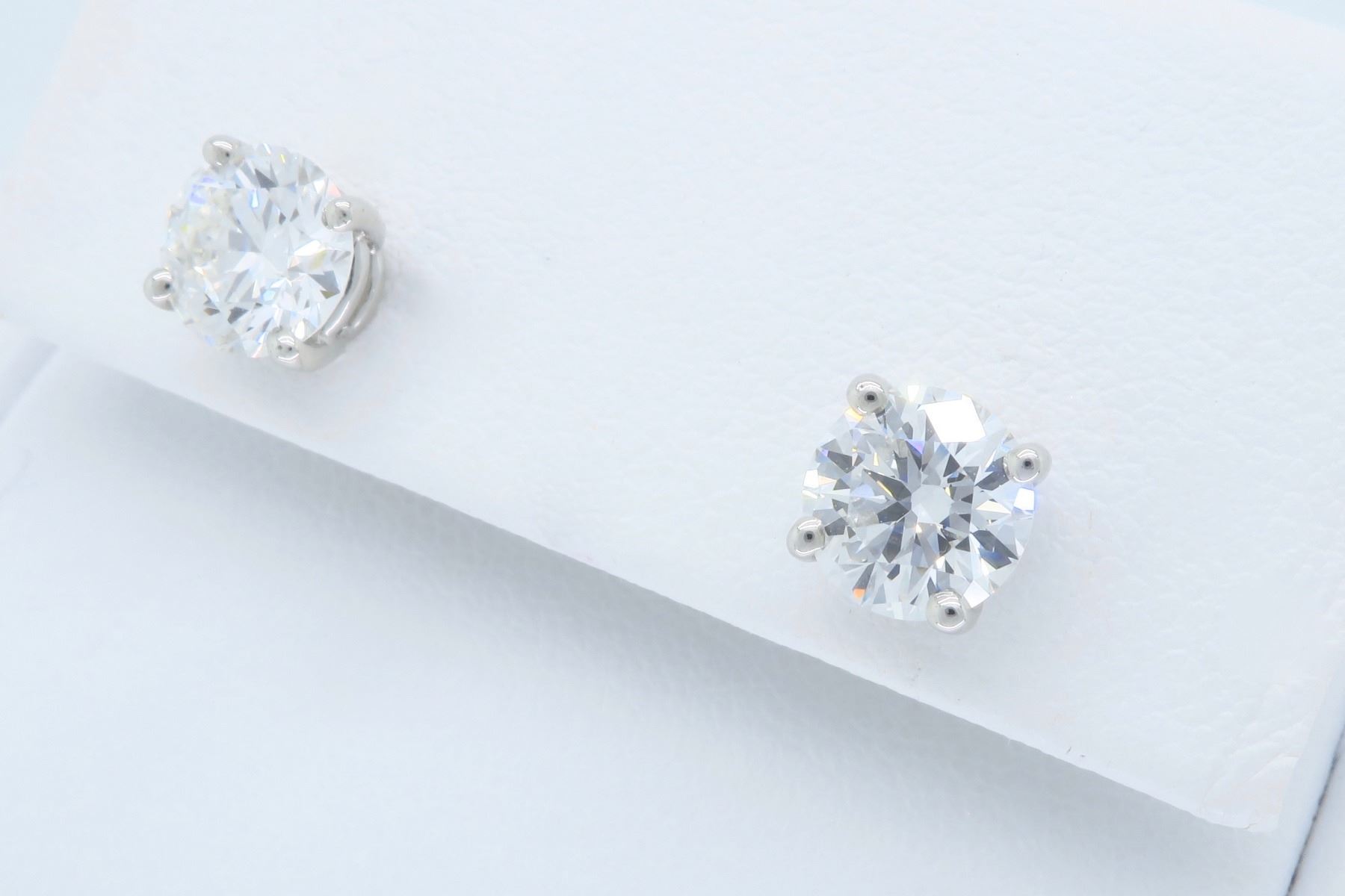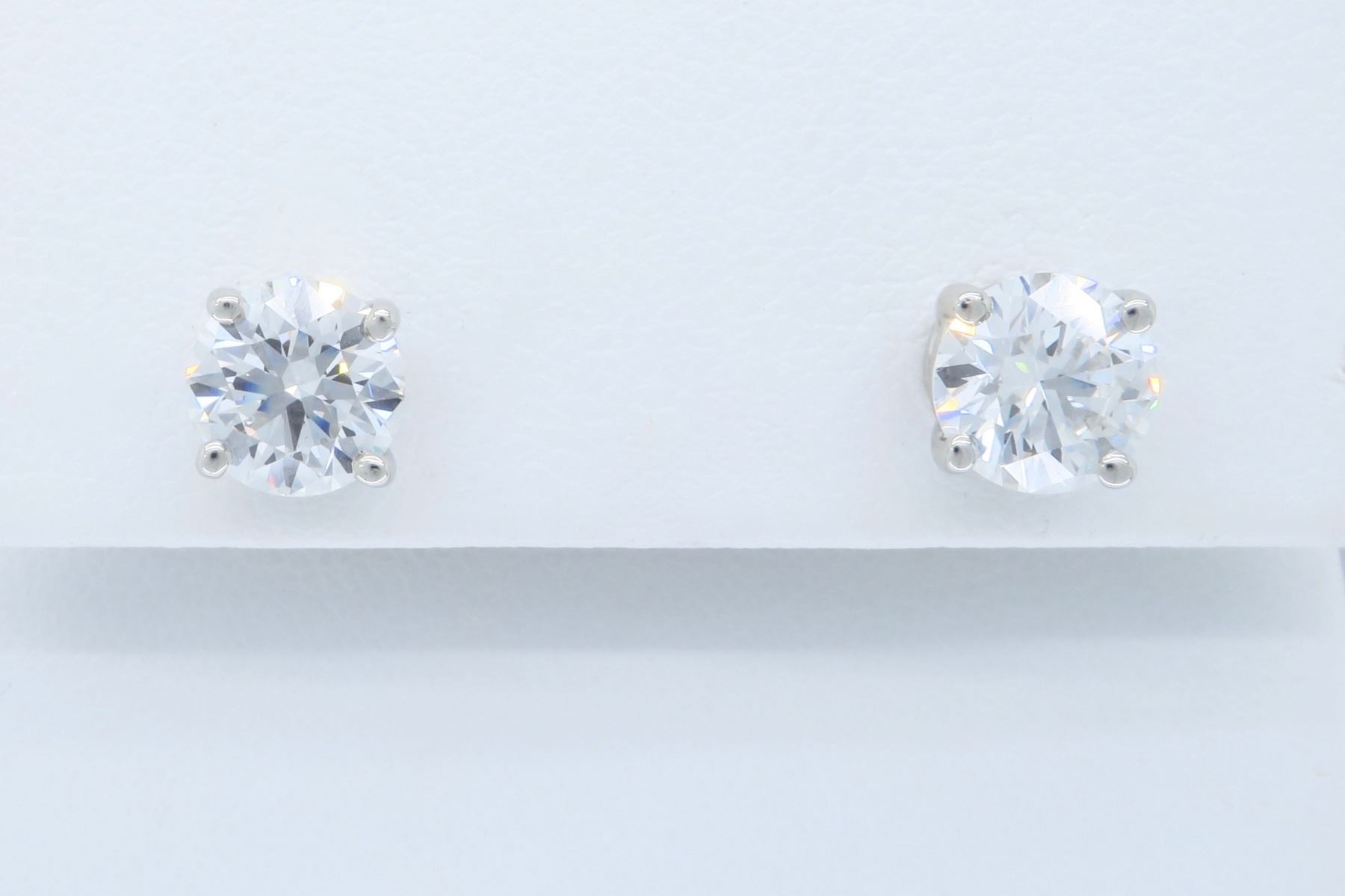 One Tiffany & Co Platinum 1.93ctw Diamond Earrings. (1) round Tiffany's Diamond with a total weight of 0.97cts with a color of I and clarity of VS-1. (1) round Tiffany's Diamond with a total weight of 0.96cts with a color of I and clarity of VVS-2. Total weight of these earrings are 2.8 grams.