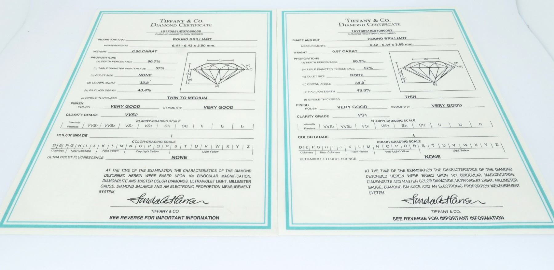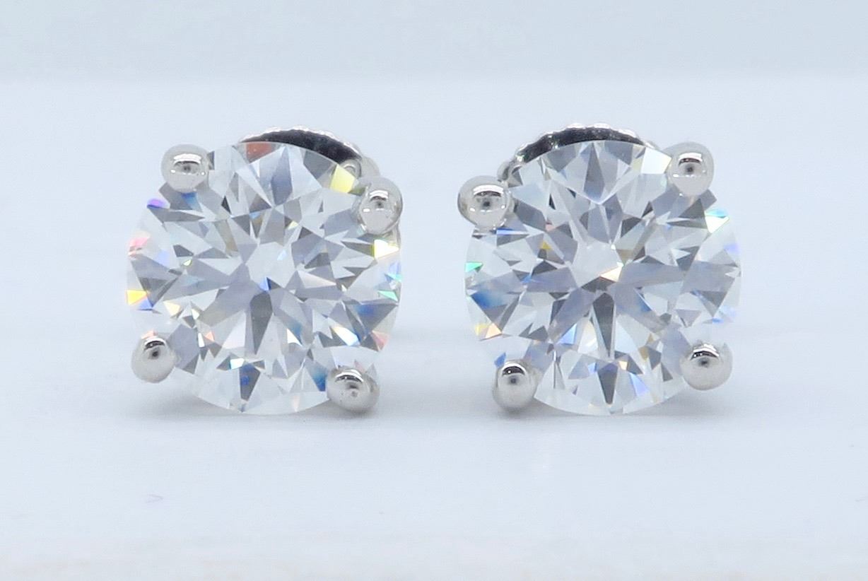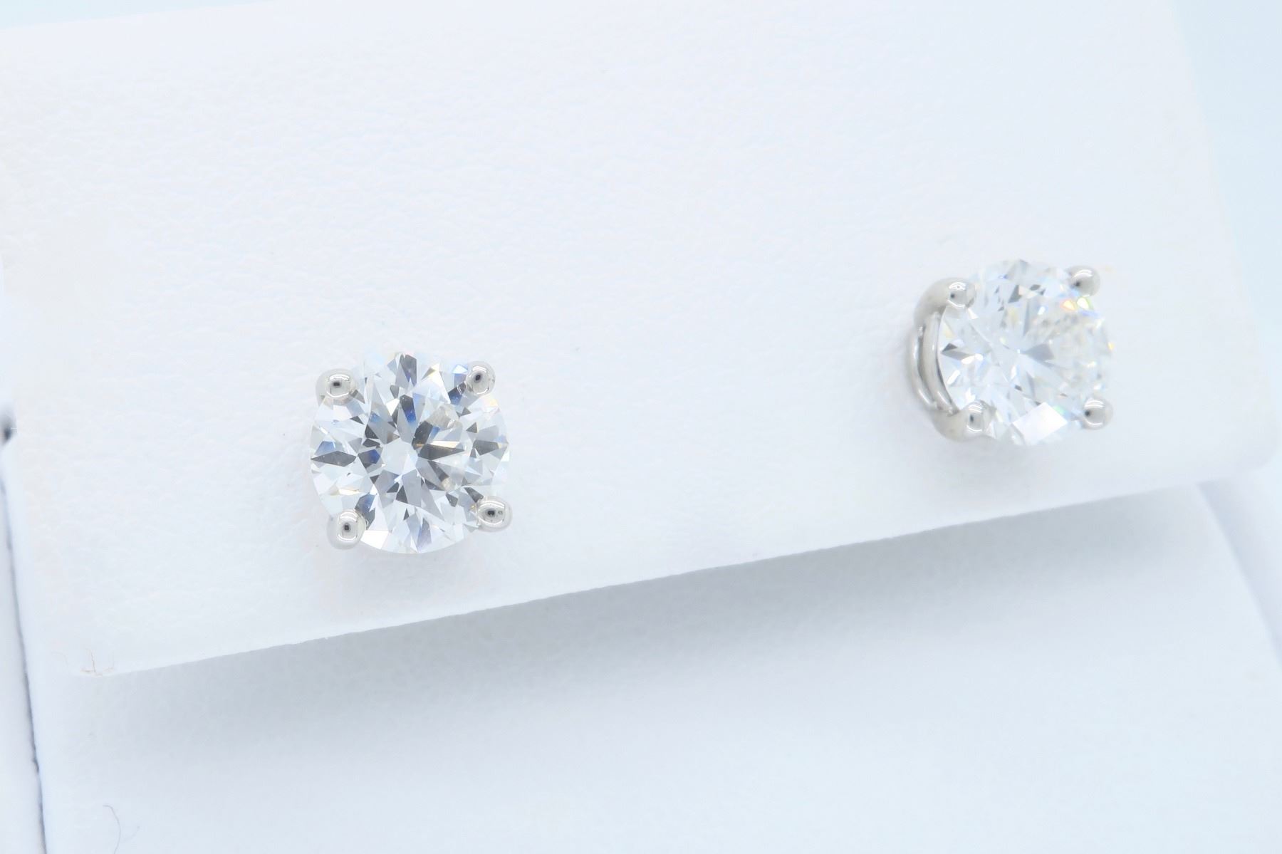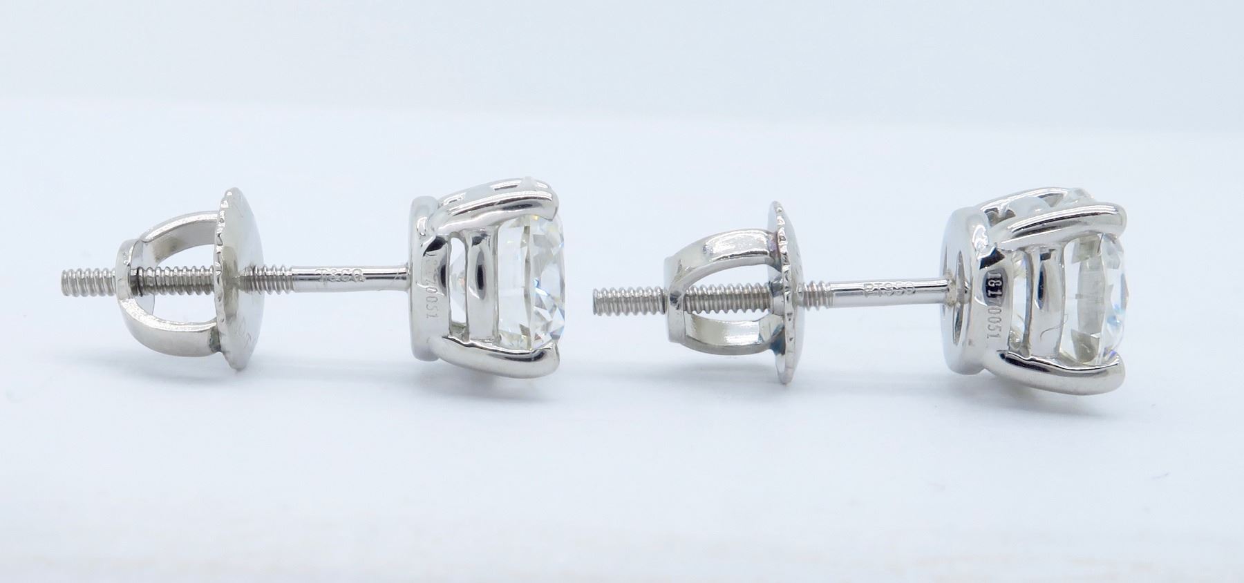 One Tiffany & Co Platinum 1.93ctw Diamond Earrings. (1) round Tiffany's Diamond with a total weight of 0.97cts with a color of I and clarity of VS-1. (1) round Tiffany's Diamond with a total weight of 0.96cts with a color of I and clarity of VVS-2. Total weight of these earrings are 2.8 grams.