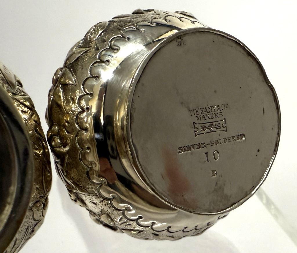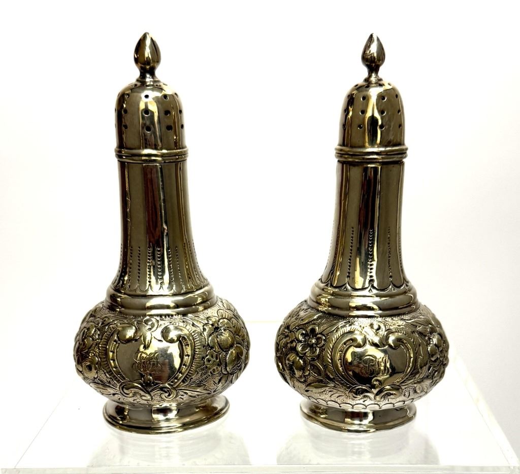 Item/Description: Tiffany & Co. repousse silver-soldered salt and pepper shakers, featuring bulbous, ornate bases adorned with embossed floral, foliate, and scroll patterns around a central shield motif. The body tapers into a tall, cylindrical neck with vertical fluting, culminating in a pierced, domed top with a pointed. Engraved with initials "PH". Bottom marked "7043 Tiffany & Co. Makers Silver-Soldered 10".