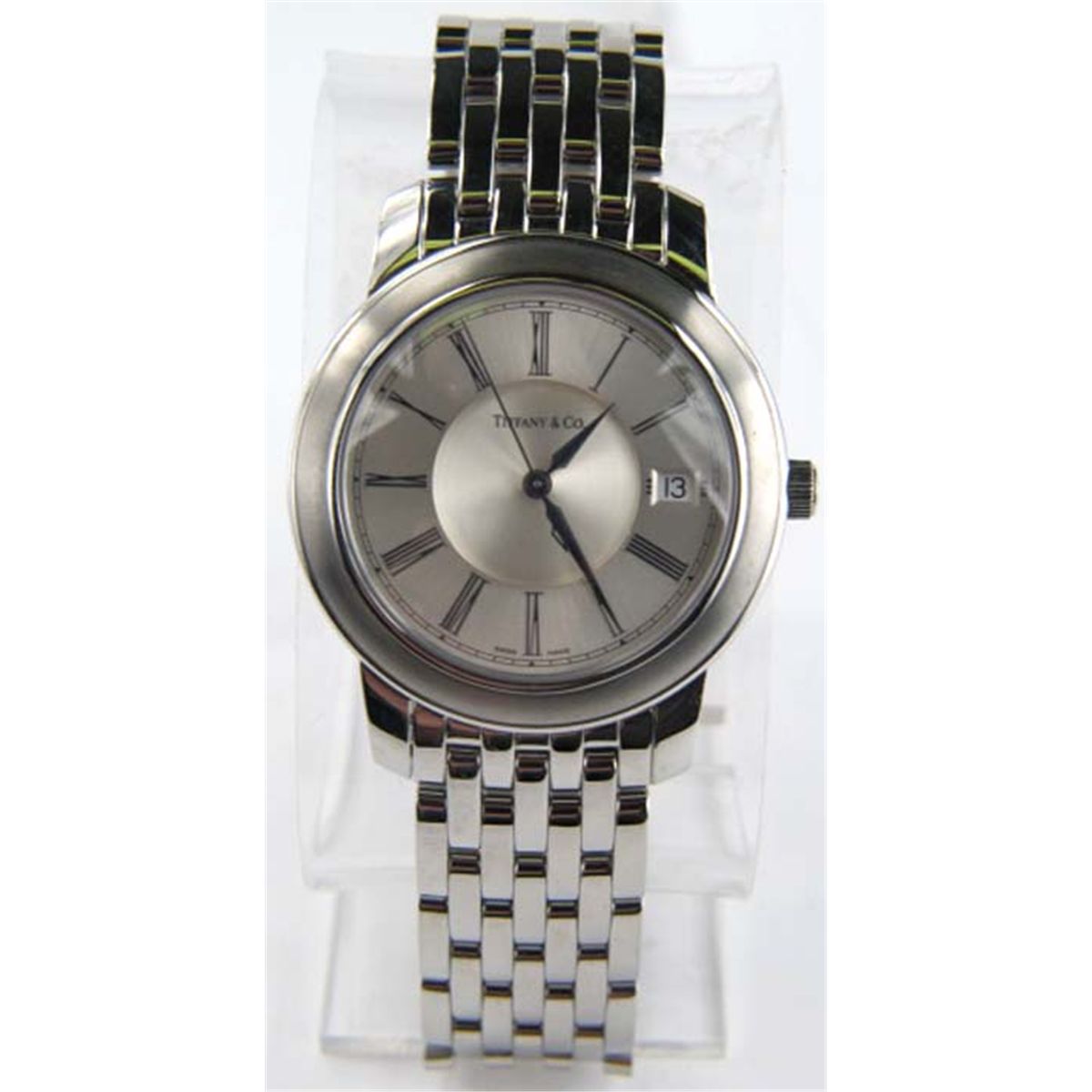 Tiffany & Co Stainless Steel Roman Numerals Date Just Watch.The total watch's weight is122.2 grams.The measurements of watch head is 35 x 35mm and 7 mm thick.The length of watch: 9 ".water Resistant.swiss made.Chain is 17 mm wide