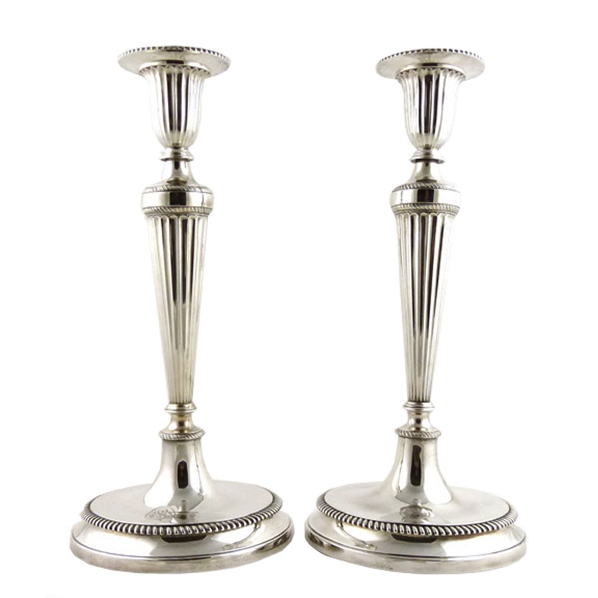 Pair of exquisite Tiffany & Co. sterling silver candlesticks. These 15'' early twentieth century candlesticks are a reproduction of an eighteenth century Georgian design by noted English silversmith John Schofield. Each candlestick rests on a spreading 6.75'' circular base decorated with a gadroon border. Both candlesticks are marked ''Tiffany & Co. Makers Sterling Silver'' on the bottom and stamped with an ''M'', representing the directorship of John C. Moore II between 1907 and 1947. Another mark indicates the date of the original Schofield design as 1784. Total weight of the pair is 64.5 troy ounces. Each candlestick is elegantly monogrammed with the letter ''S''. The silver bobeches are removable. Near fine.