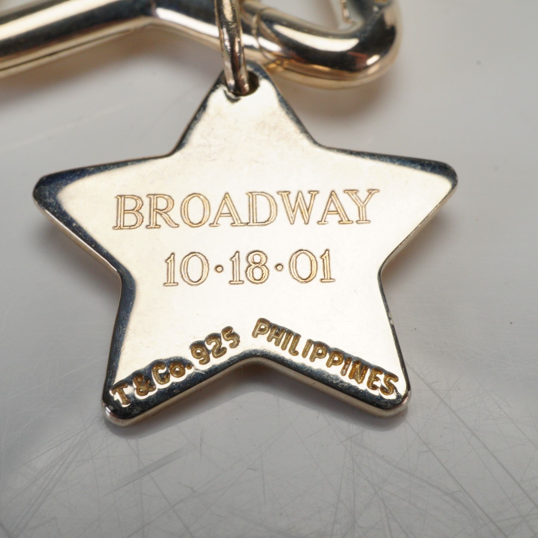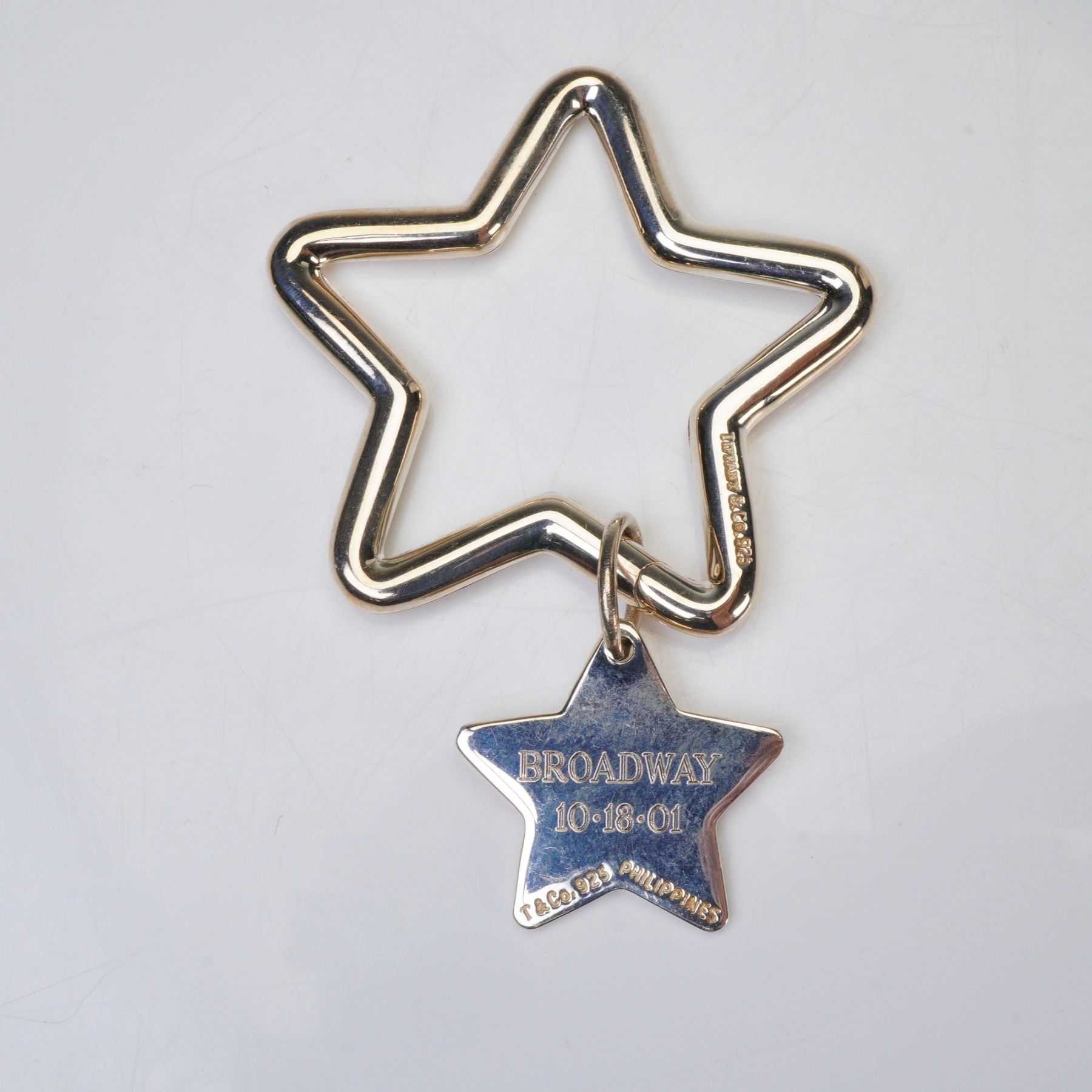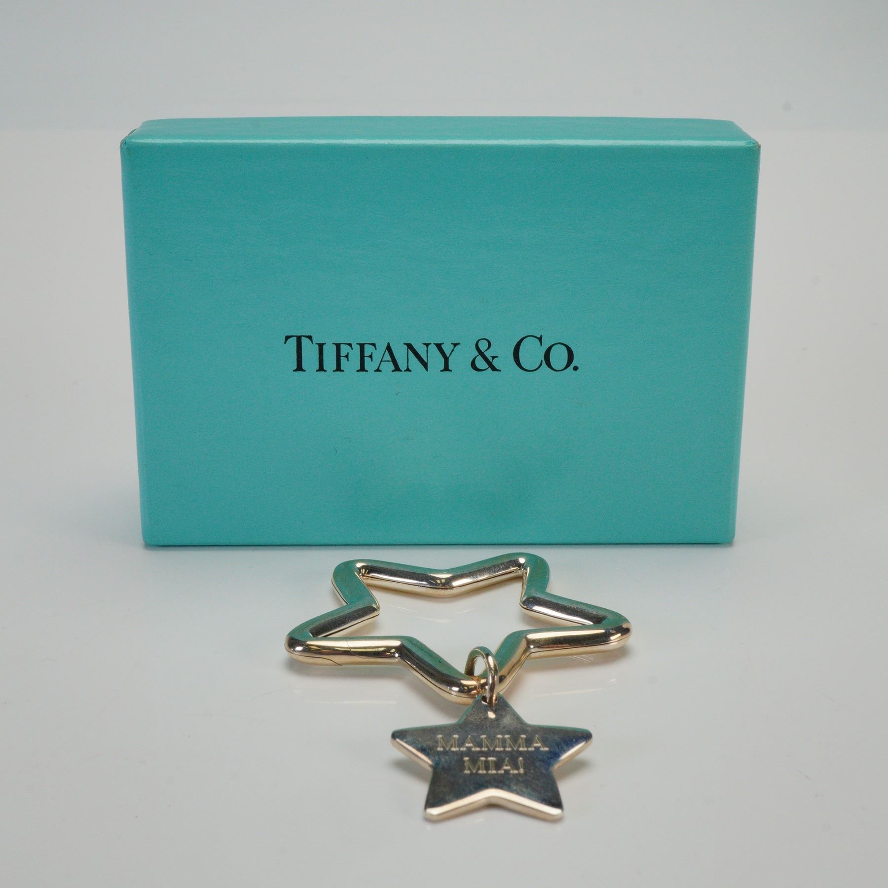 Commemorative Tiffany & Co. sterling silver star-shaped key ring celebrating the Broadway debut of Mamma Mia! on October 18, 2001. Features a polished open star form with a smaller engraved star charm reading "MAMMA MIA!" on one side and "BROADWAY 10-18-01" on the reverse. Stamped "T&Co. 925 PHILIPPINES." Includes original Tiffany & Co. presentation box. Weight: 15.5 g.