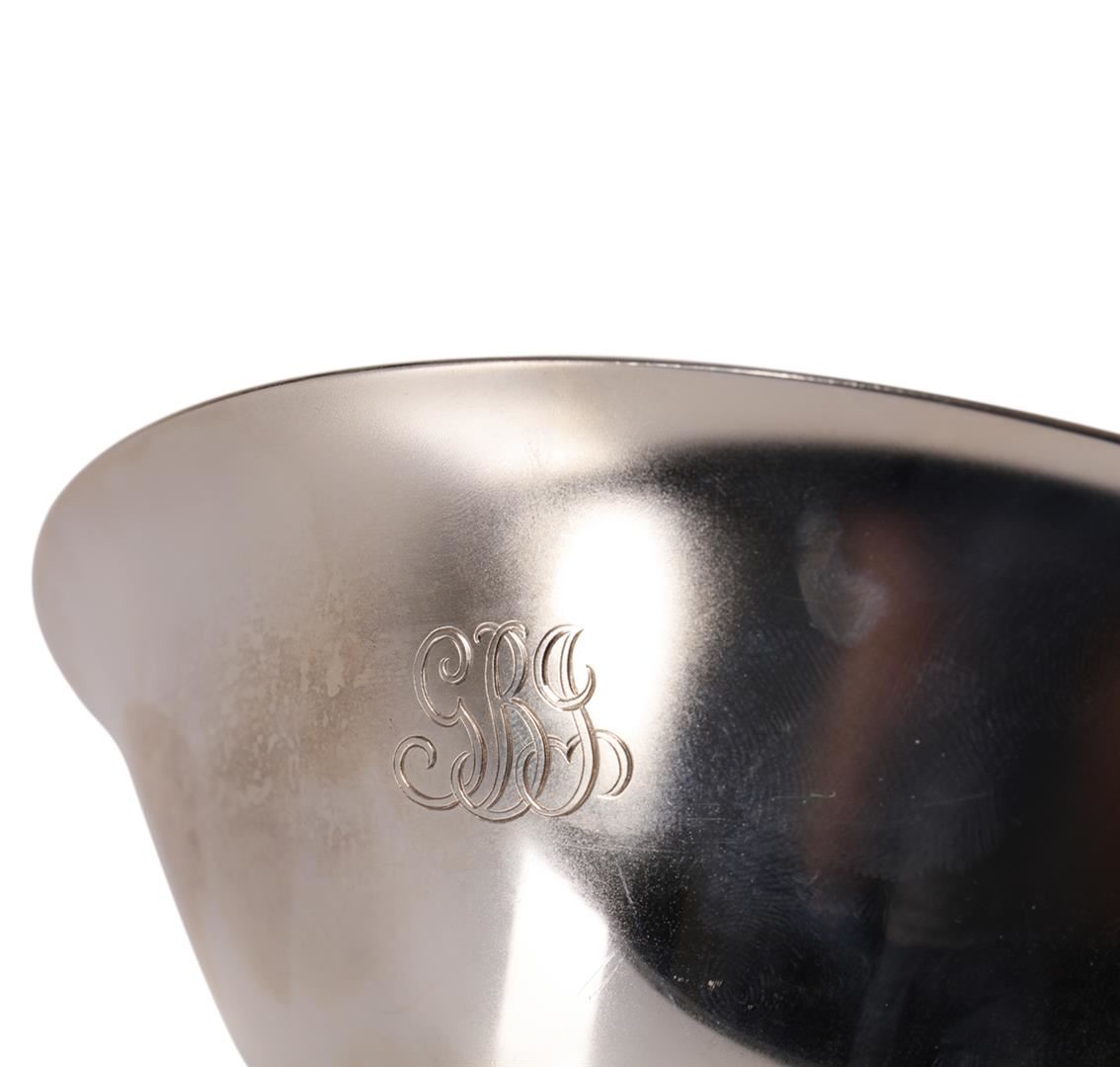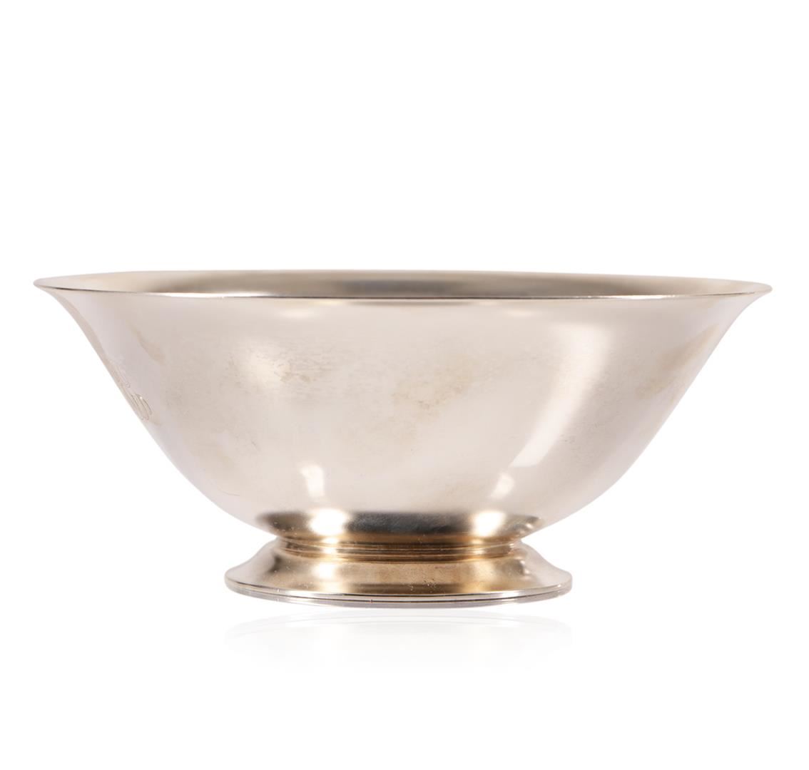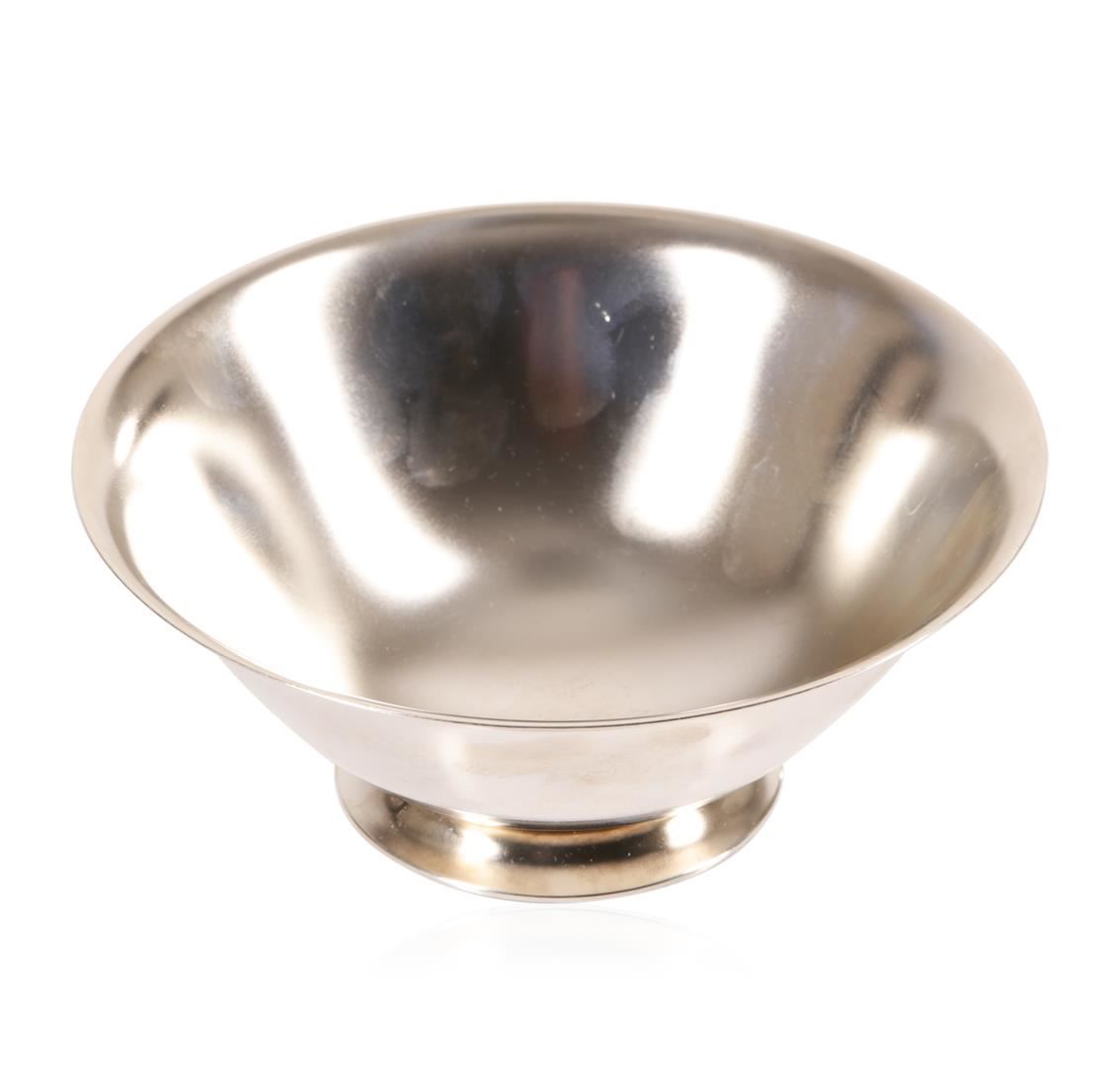 Stunning 1950s Tiffany & Co. Sterling Silver Paul Revere Form Bowl #20660. Fresh from estate. You are bidding on a vintage Tiffany & Co. mid century modern sterling silver footed bowl. This lovely statement piece is marked for Tiffany & Co. makers, Sterling Silver #20660 M Circa 1935-1947. Monogrammed "GBJ". This piece has been professionally polished. Weight: 243.59 grams. Diameter: 5-1/2 inches. Height: 2-5/8 inches. Pattern: 20660.
