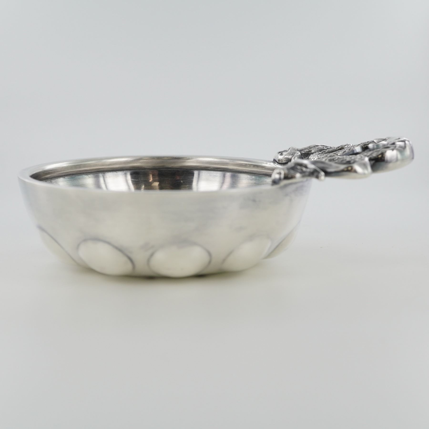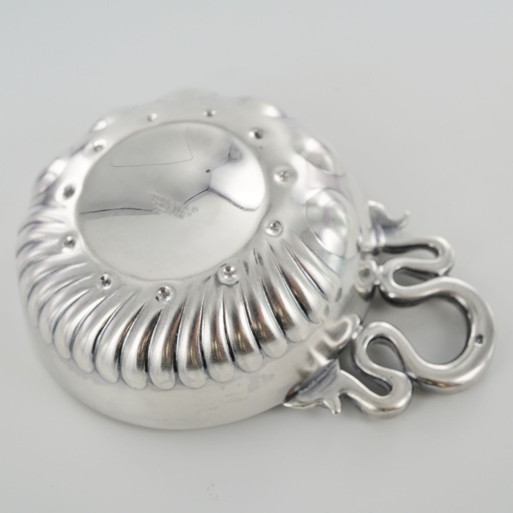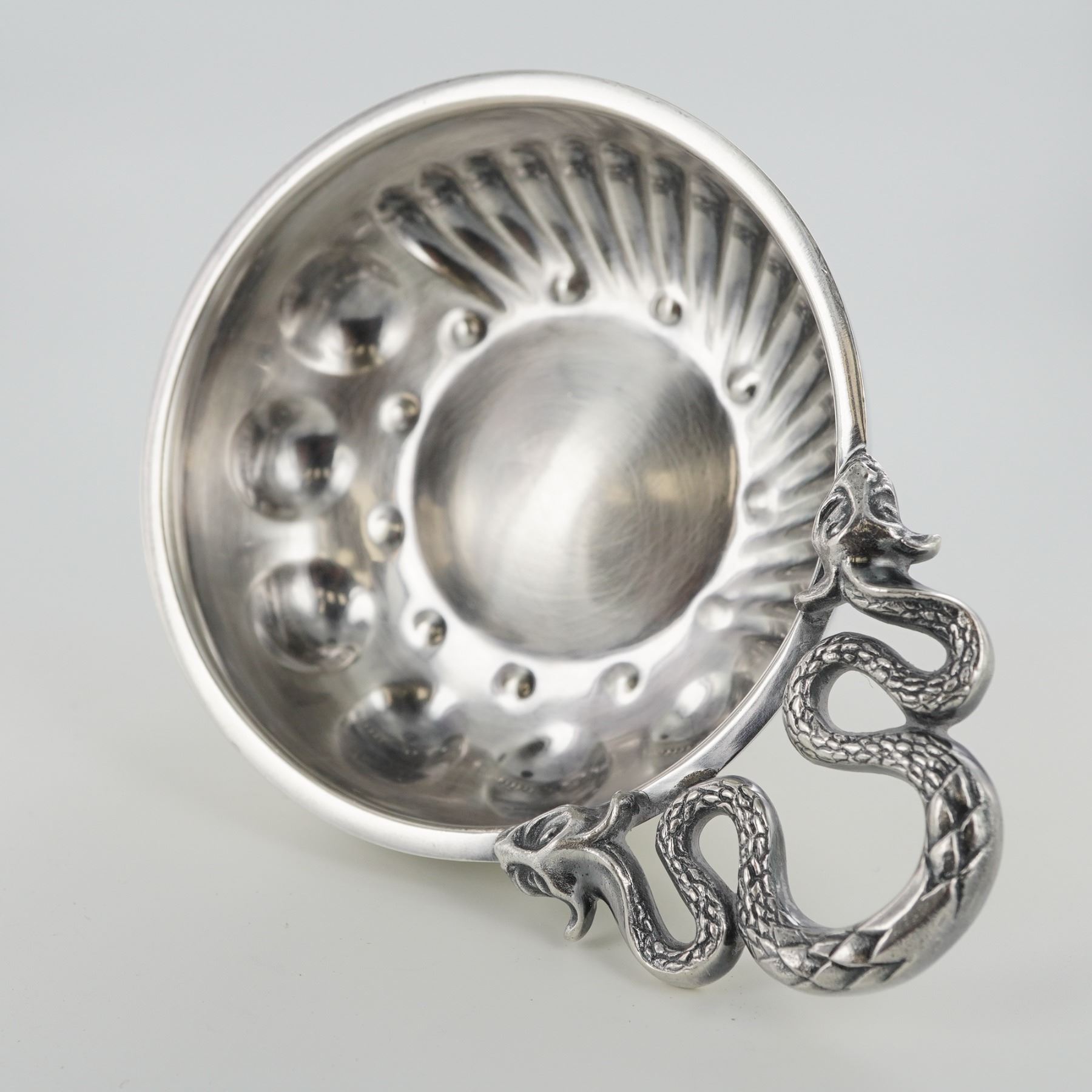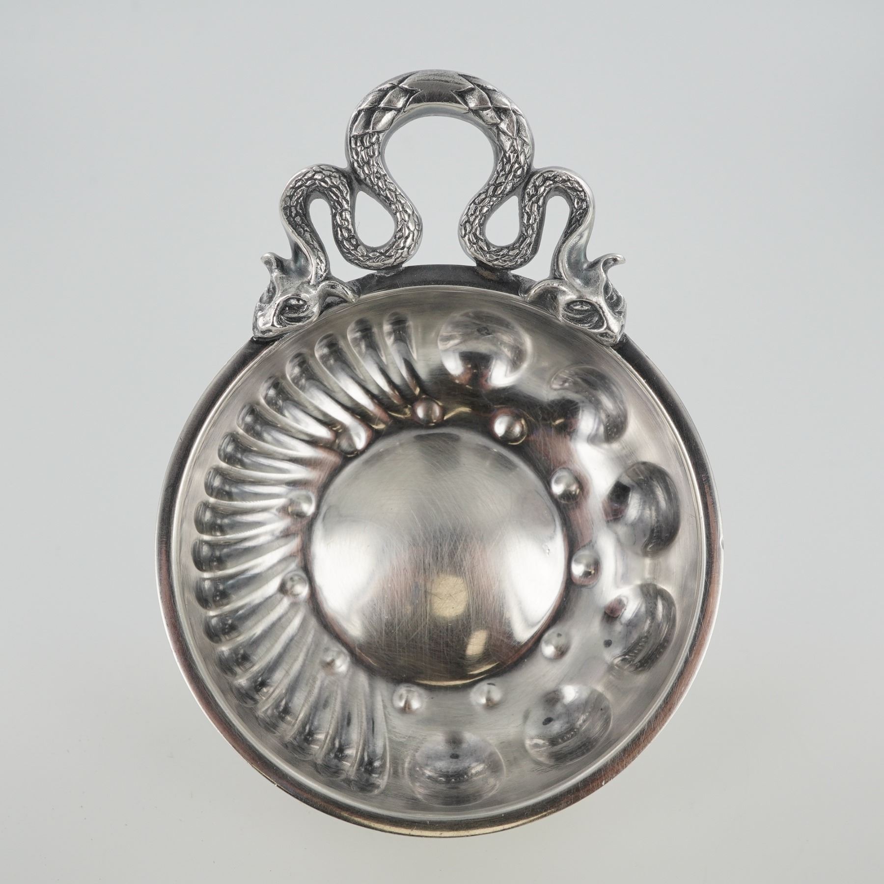 This Tiffany & Co. sterling silver tastevin features a unique snake handle with entwined serpents, combining elegant design with functional artistry. Stamped with Tiffany & Co. sterling and made in France, it weighs 115.6 g.