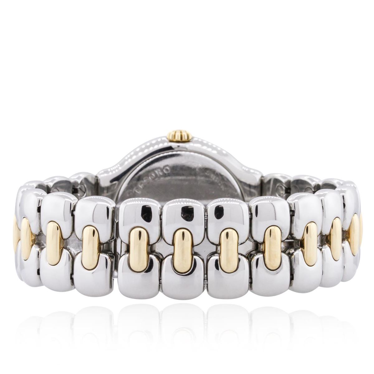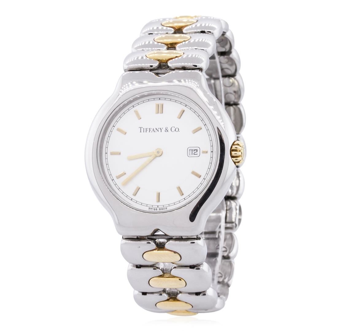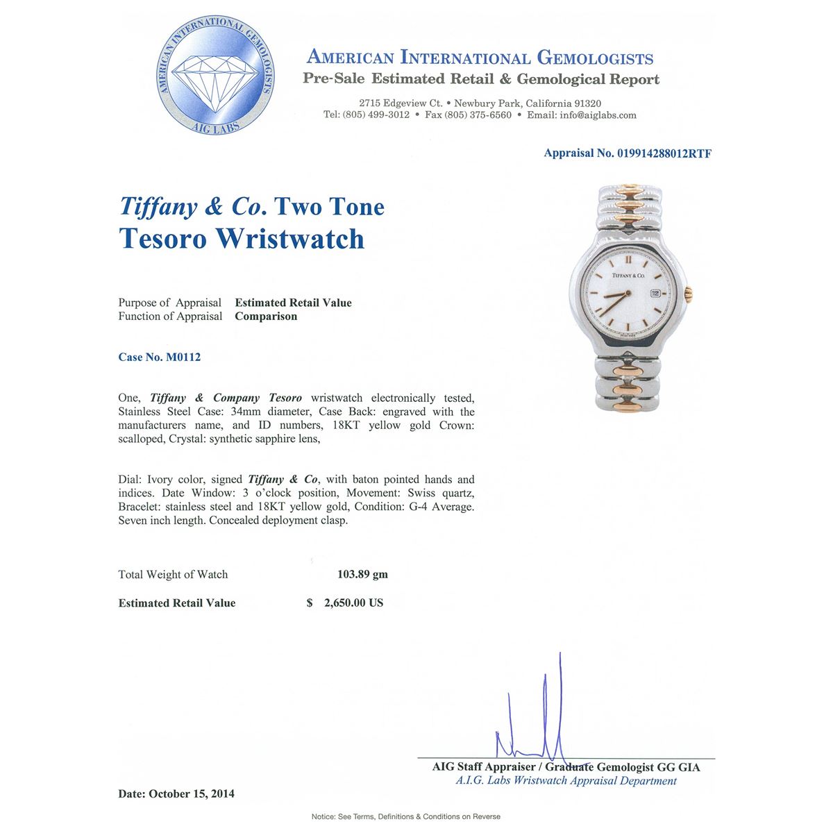 One, Tiffany & Company Tesoro wristwatch electronically tested, Stainless Steel Case: 34mm diameter, Case Back: engraved with the manufacturers name, and ID numbers, 18KT yellow gold Crown: scalloped, Crystal: synthetic sapphire lens, Dial: Ivory color, signed Tiffany & Co, with baton pointed hands and indices. Date Window: 3 o'clock position, Movement: Swiss quartz, Bracelet: stainless steel and 18KT yellow gold, Condition: G-4 Average. Seven inch length. Concealed deployment clasp. Total Weight of Watch 103.89 grams. AIG Appraised at $2,650.00.