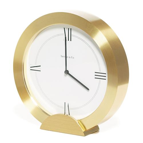 Tiffany & Co. clock, round and footed form in gold, white face with black Roman numerals and hands, marked, #215742, 6" x 6"