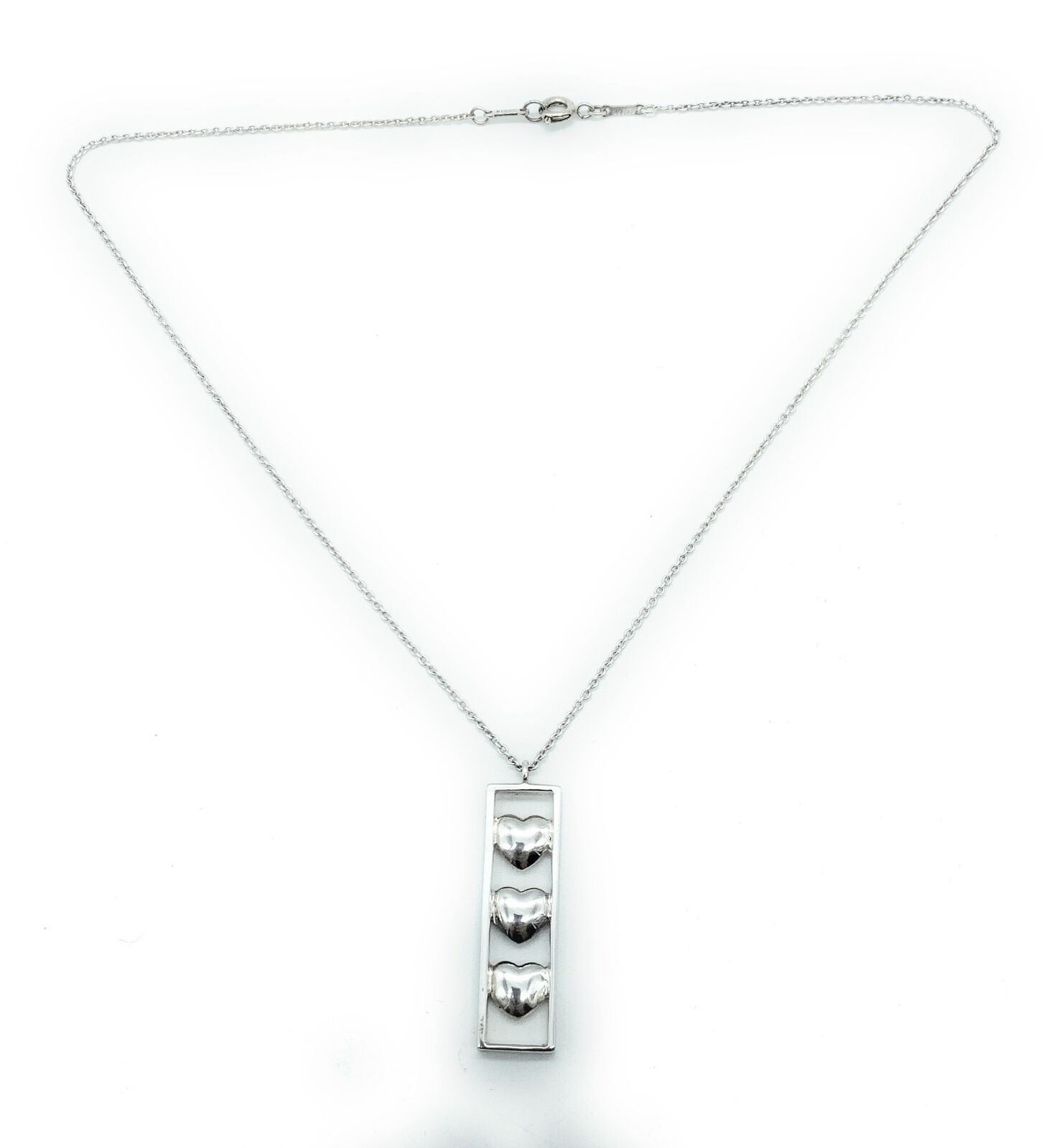 RARE! Tiffany & Co. Elsa Peretti Sterling Silver Triple 3 Heart Bar Pendant 16.5" necklace. This is a lovely three heart bar pendant made of sterling silver from Tiffany & Co. It comes on a 16.5" chain.