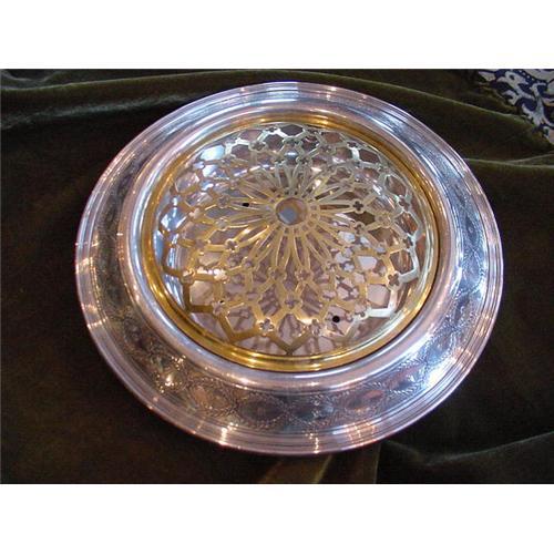 This is a lovely early 20th century Tiffany sterling centerpiece bowl with floral arrangement lid. This large, heavy bowl measures 14 1/4" in diameter and is 3" high. The "cut out" gilt brass lid fits into a removable silverplate bowl with four holes and handles. The lid and bowl are well marked Tiffany & Co. The Outer sterling bowl has an entwined leaf design with flower centers encircling the rim. Marks on the base are Tiffany & Co., 19226A Makers 3739, Sterling Silver,, "M" dating the piece to 1907-1938. It is in excellent condition.