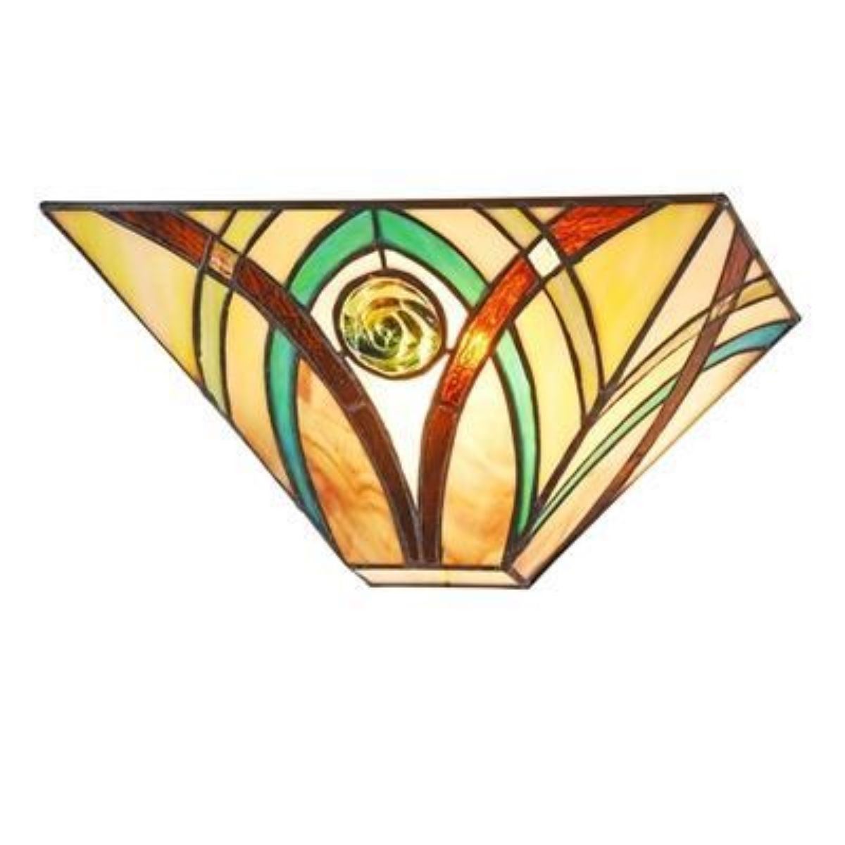 Tiffany-style Mission, 1 light, modern design, stained art glass sconce light with 58 pieces of cut art glass & 1 glass bead, wrapped in copper foil with textured black finish. 5" H X 12" W X 6" L. **** You bid is for 1 sconce light, but multiples of this item are available by request - single sconce, matching pair, set of four or set of 6.