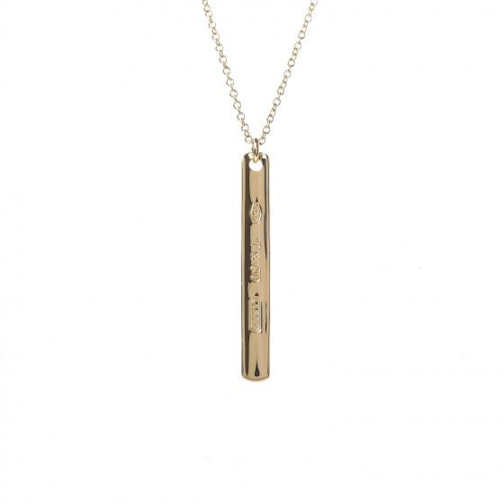 Crafted of an 18 karat yellow gold chain that holds a bar shaped pendant stamped with signature Tiffany and 1837 engravings.