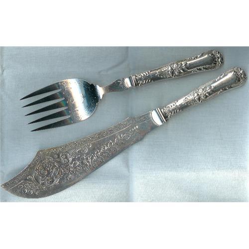 More pics. available. A beautiful pair of Fish Servers made by Tiffany & Co. Silver Plated. The Blade on the flat server is pierced and is marked EPNS for Electro Plated Nickel Silver. It is 12.25" long and 2.25" at the widest point. The Fork is marked "Tiffany & Co. E.P. just below the ferrule. The pierced server is not marked so.The Fork is 9.1/2" long and 2" at the widest point. I cannot trace the name of the pattern. Tiffany & Co stopped production of Silver Plated Flatware in 1931. There is very light normal wear evidence, no damage.