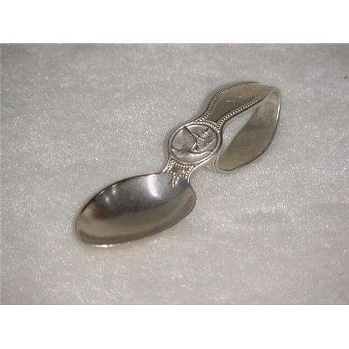 A Tiffany & Co. sterling silver baby feeding spoon, 4" long. Mother Goose is sitting there on the handle of the spoon just where the baby will see her. The handle is also engraved with the initals Y.H.B.. Spoon signed Tiffany & co, Pat. 1911
