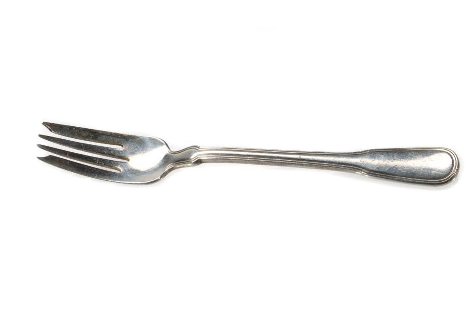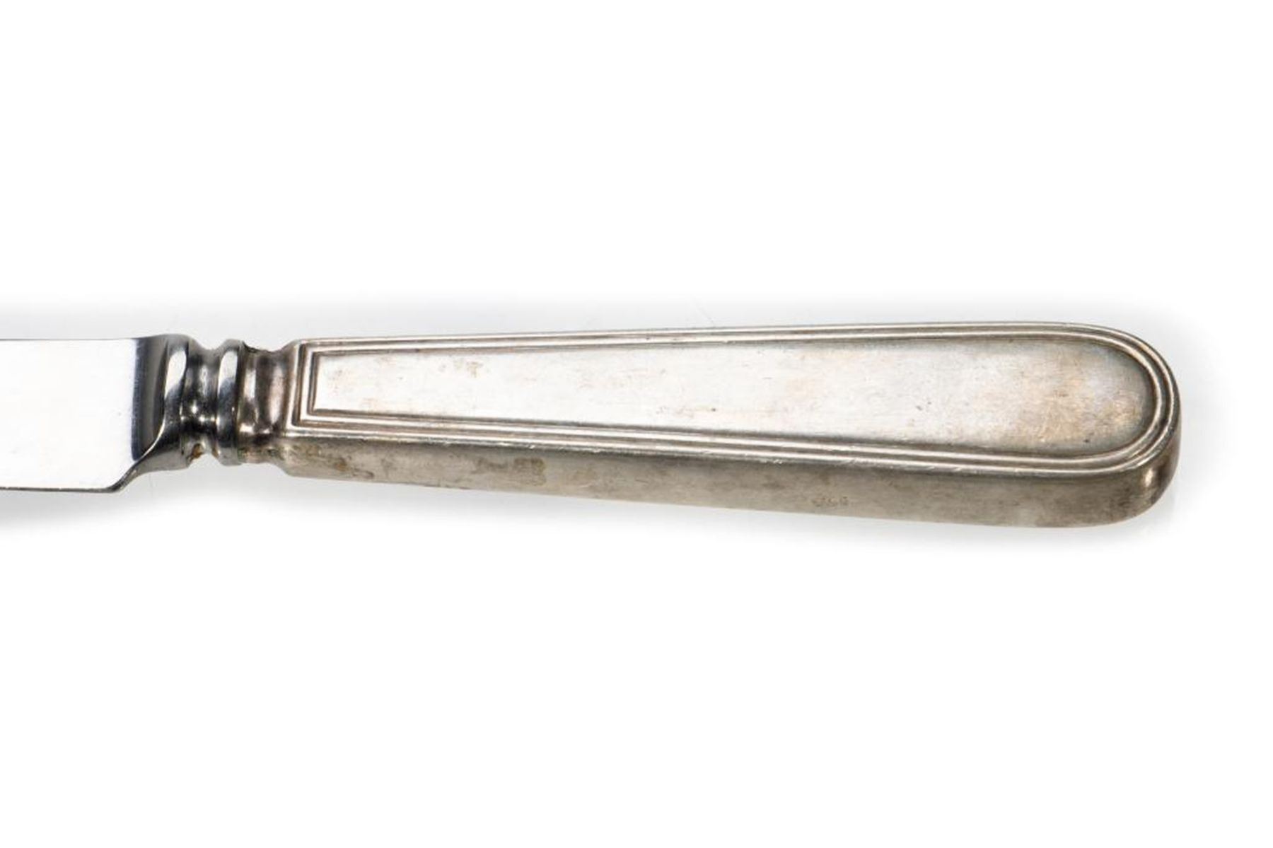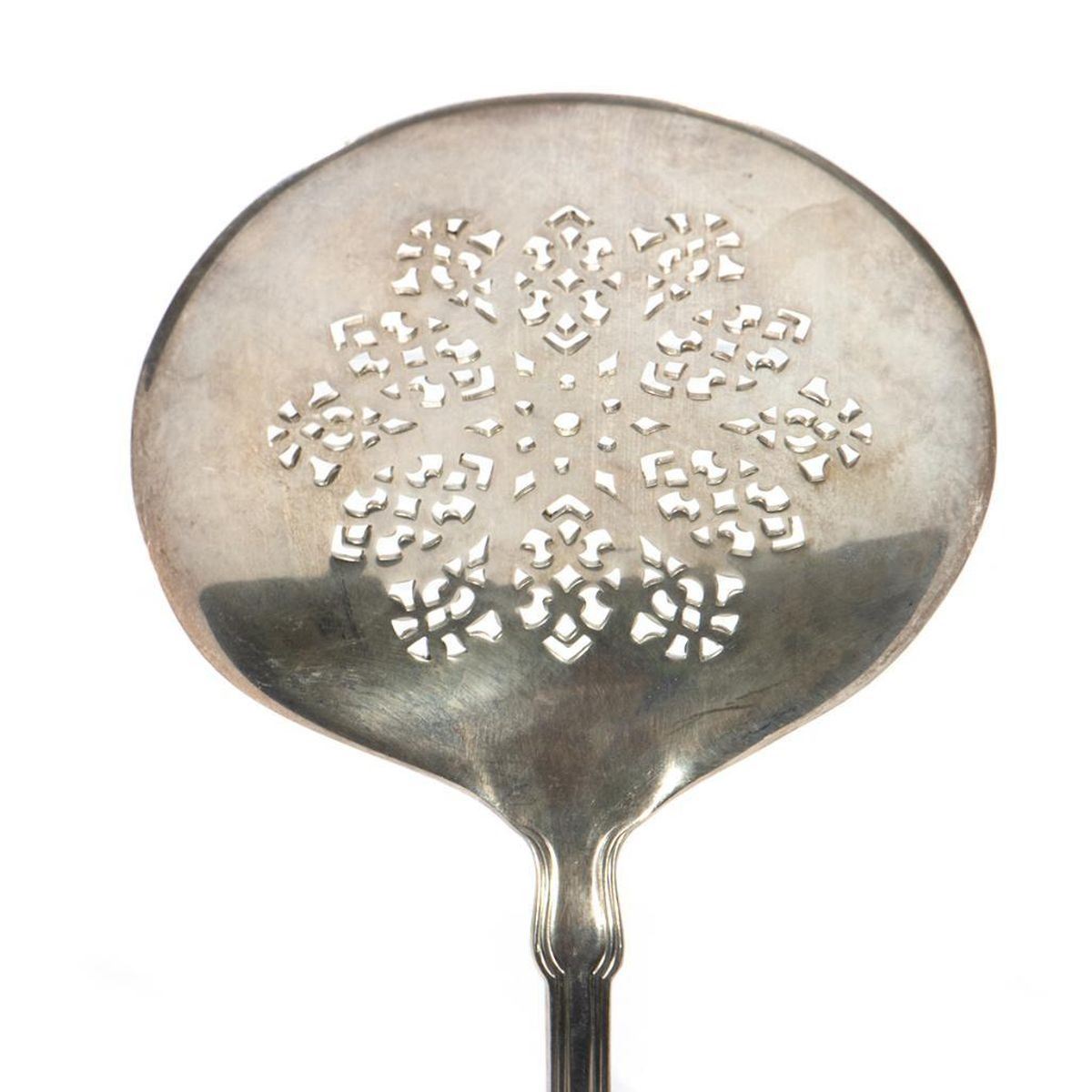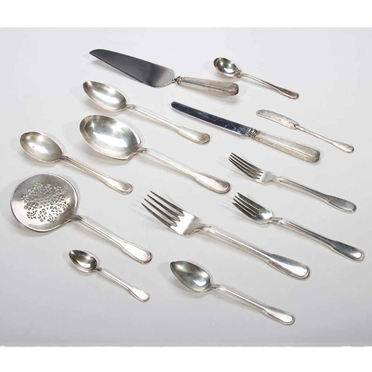 Circa 1930. Forty Seven pieces: Six each of Dinner Forks, Salad Forks, Dinner Knives, and Teaspoons. One Butter knife. Four each of Hors d'oeuvres Forks, Soup Spoons, Demi-Tasse Spoons and Serving Spoons. Two larfge Serving Spoons. One each of Pierced Fruit Server, Butter Knife, Pie Server and Meat Fork. Condition: Good, minor tarnish. No monograms