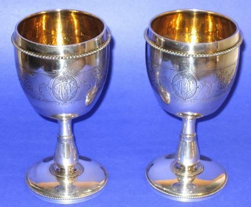 Circa 1870-76 matching pair of Tiffany & Co.Goblets, Union Square. Engraved Griffin motif. Extensive hand chasing. Monogrammed "CM". Gold wash interior. Early Union Square mark (1870-76). (7-14)
