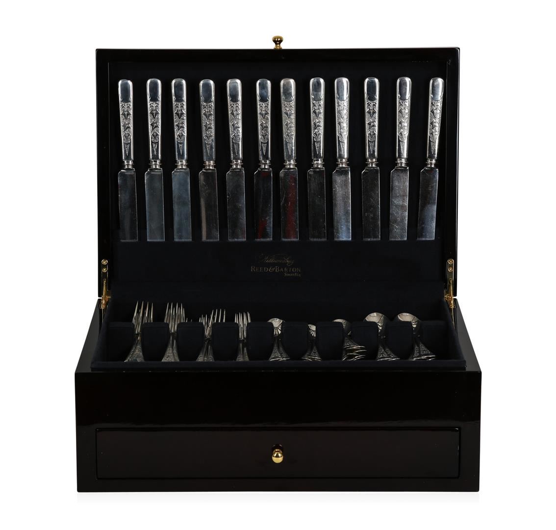 Circa 1870, very rare in excellent condition antique Ivy pattern engraved. No monogram!! Highly collectible! Fully marked, exquisite detail. Stunning. Includes a beautiful custom rosewood inlaid mahogany Reed and Barton chest! This is a complete set of 96 pieces, Service for 12 that Includes: 12 dinner knives, 12 dinner forks, 12 salad forks, 21 teaspoons, 12 table spoons, 12 flat knives, 8 butter spreaders (solid )1 master butter knife, 4 casserole serving spoons, 1 pie server (solid), 1 pancake server (solid). This is the real deal, the flatware is guaranteed to be 100 percent authentic!