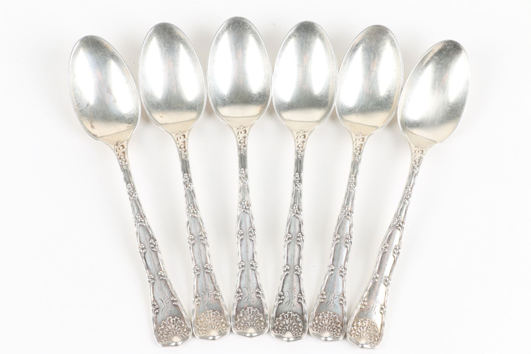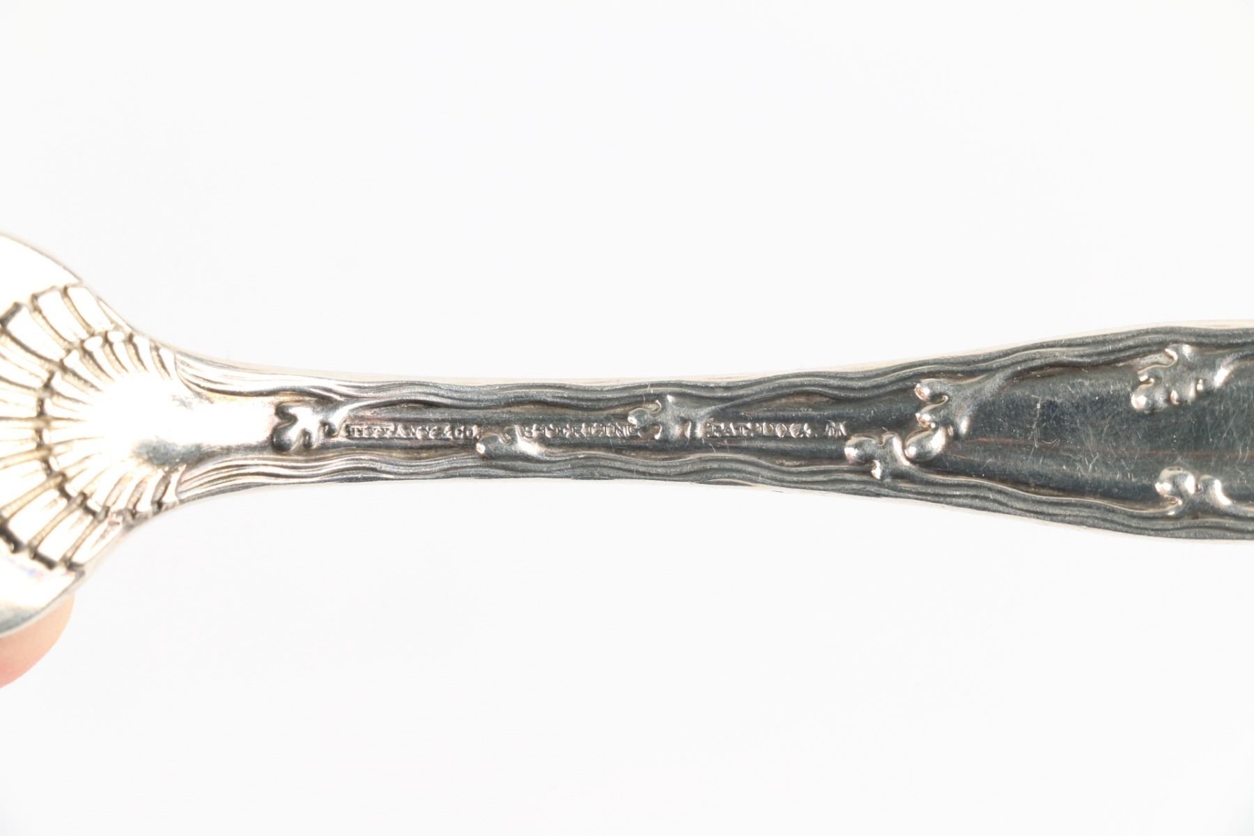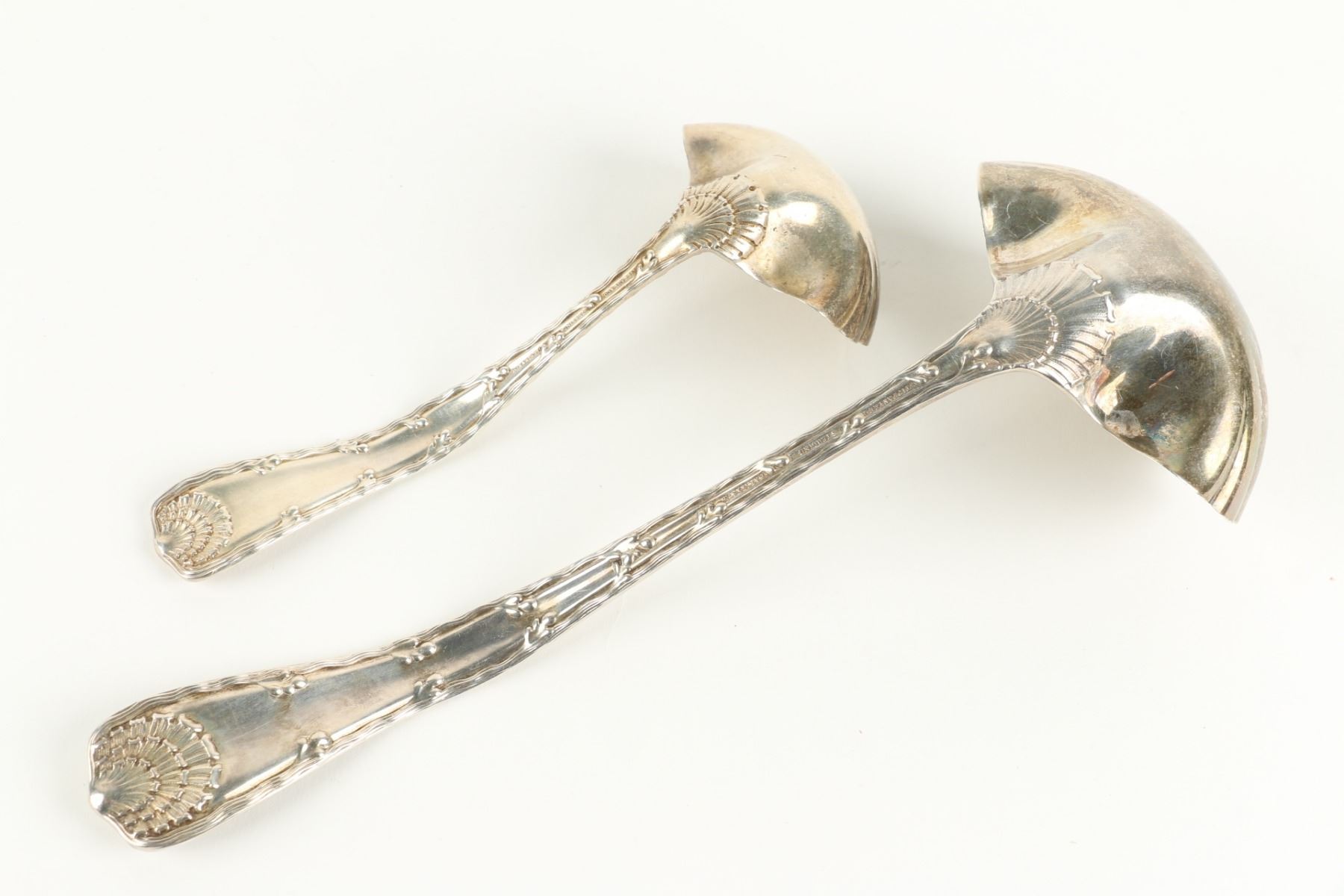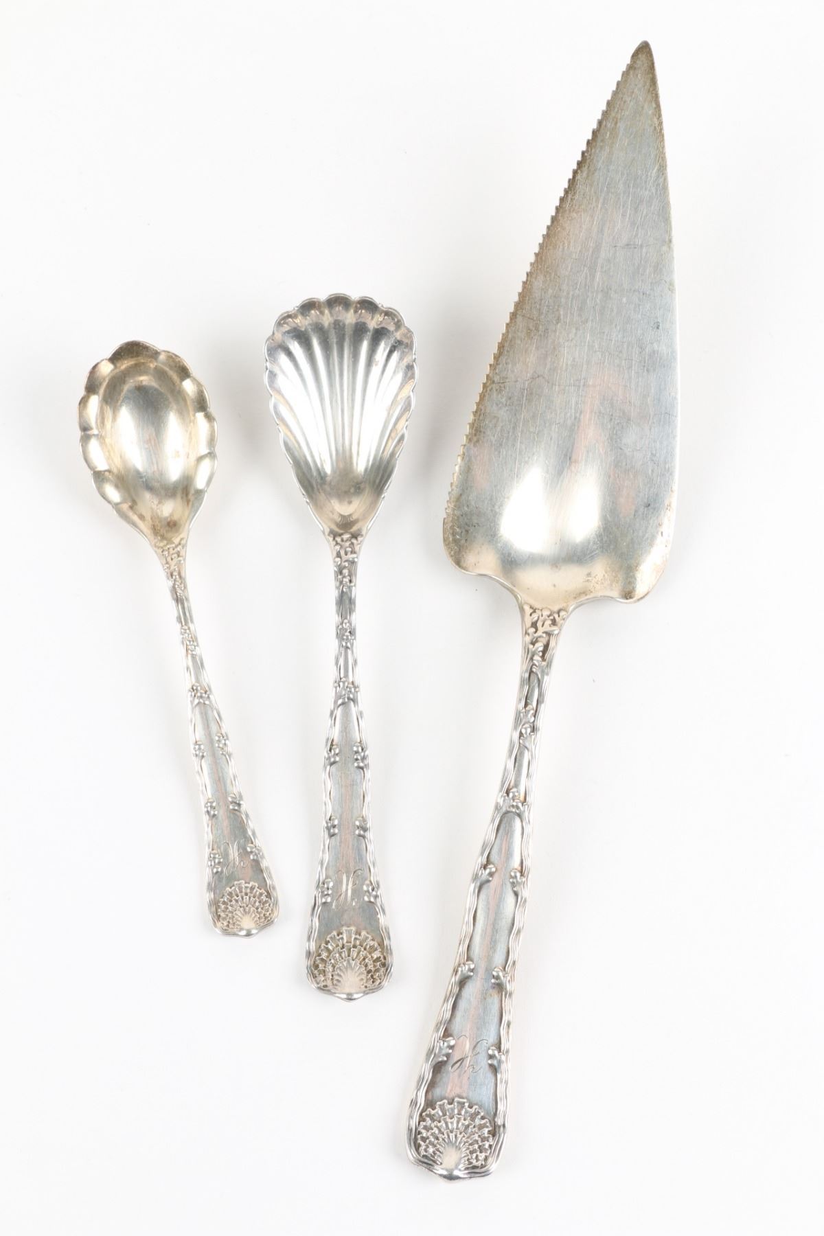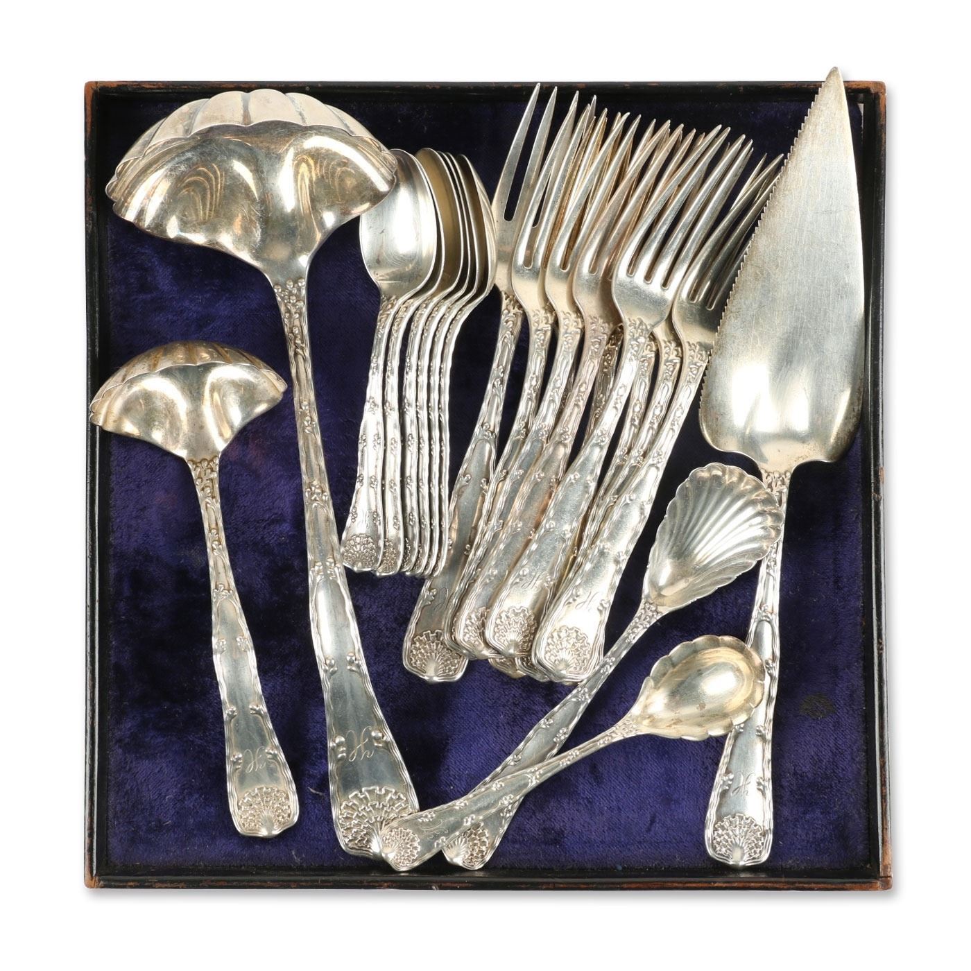 Lot 478 - American. From wealthy St.Croix, Virgin Islands, Family Sugar Cane factory owners during late 19th century. Twenty-one (21) pieces. "Wave Edge" pattern. 9 dinner forks, 1 serving fork, 6 dessert spoons, 1 pie lift, 2 ladles, 2 ladles. Gross weight, forks 824g, spoons 228g, serving pieces 504g. Total net weight 1556g. Longest piece , 11". $1200-1500.