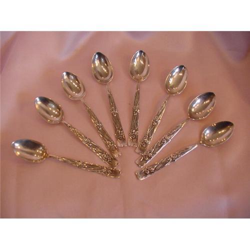 Eight beautiful Tiffany Vine sterling spoons in the Iris pattern. Each spoon measures 4 13/16" long and the bowl is 1 1/2" by 15/16". This Japanese design features embossed meandering irises on a textured background. The aesthetic design was a precursor to the Art Nouveau period. All are in excellent condition with a very nice patina. There is a very unique monogram on the back of the handle "RBF"? Made 1880.