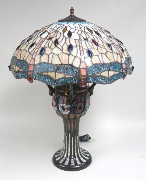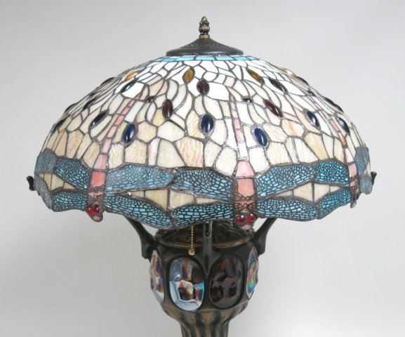 Stained glass & bronze. Approx. 31" H. Shade approx. 22" D. (4096)