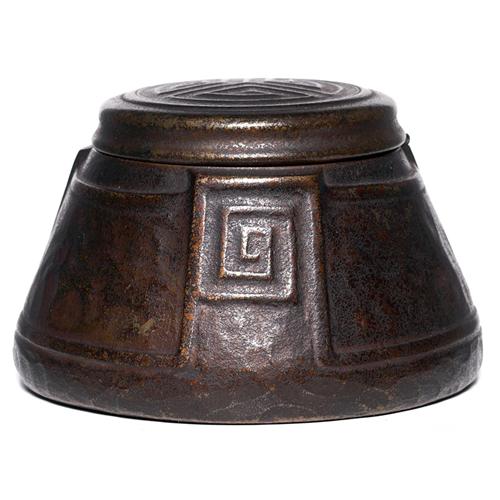 Tiffany Studios inkwell, flaring form in bronze in an Indian pattern, original patina, signed Tiffany Studios New York #1112, has glass insert,5in.w x 3.5in.h