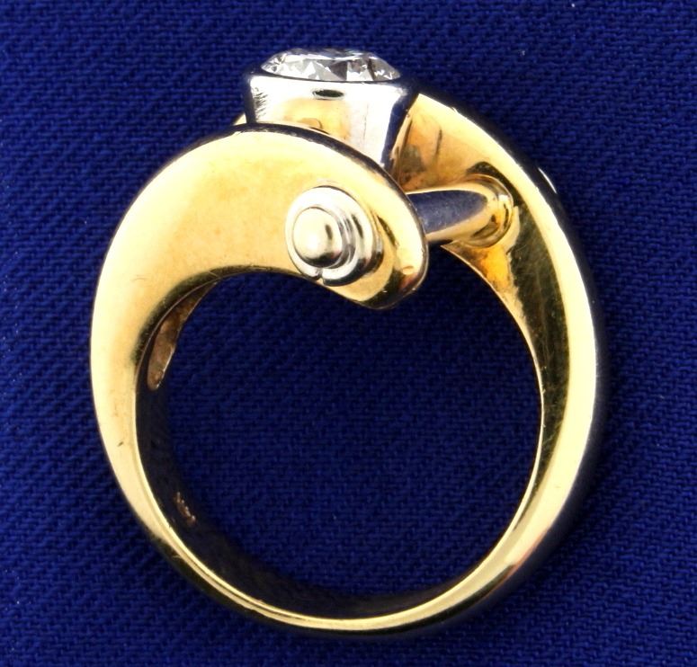 In 14k yellow and white gold. High quality 1ct diamond of SI2 clarity/G color with lots of sparkle, set in a designer, unique setting. Note that this is not a Tiffany branded ring but in the new Tiffany Barbell style. Size 7. 13.7g.