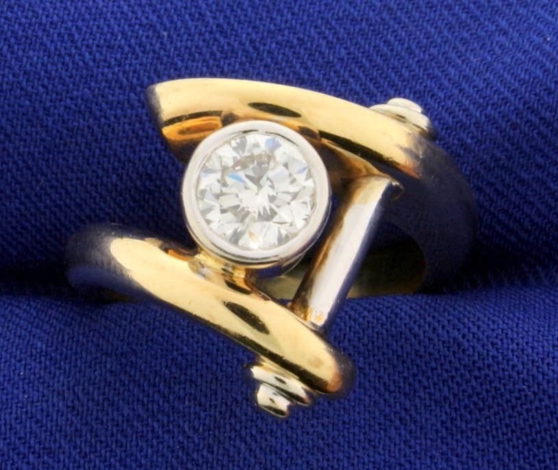 In 14k yellow and white gold. High quality 1ct diamond of SI2 clarity/G color with lots of sparkle, set in a designer, unique setting. Note that this is not a Tiffany branded ring but in the new Tiffany Barbell style. Size 7. 13.7g.