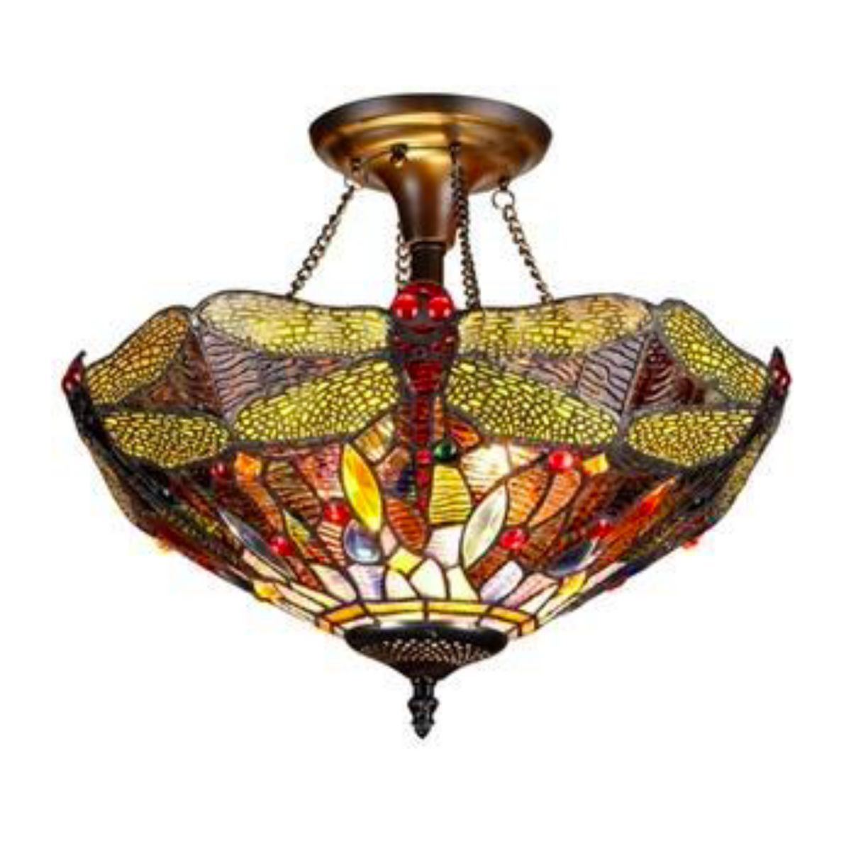Tiffany-style, Dragonfly, stained art glass, 2-light, ceiling mount fixture, handcrafted with 275 pieces of stained art glass & 15 crystals,  wrapped in copper foil, with a dark antique bronze finish & Dragonfly motif. 13 1/2" H. 16" W shade.Â