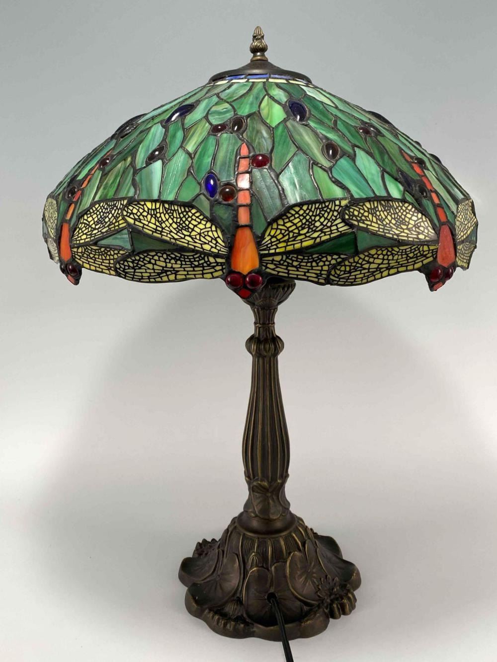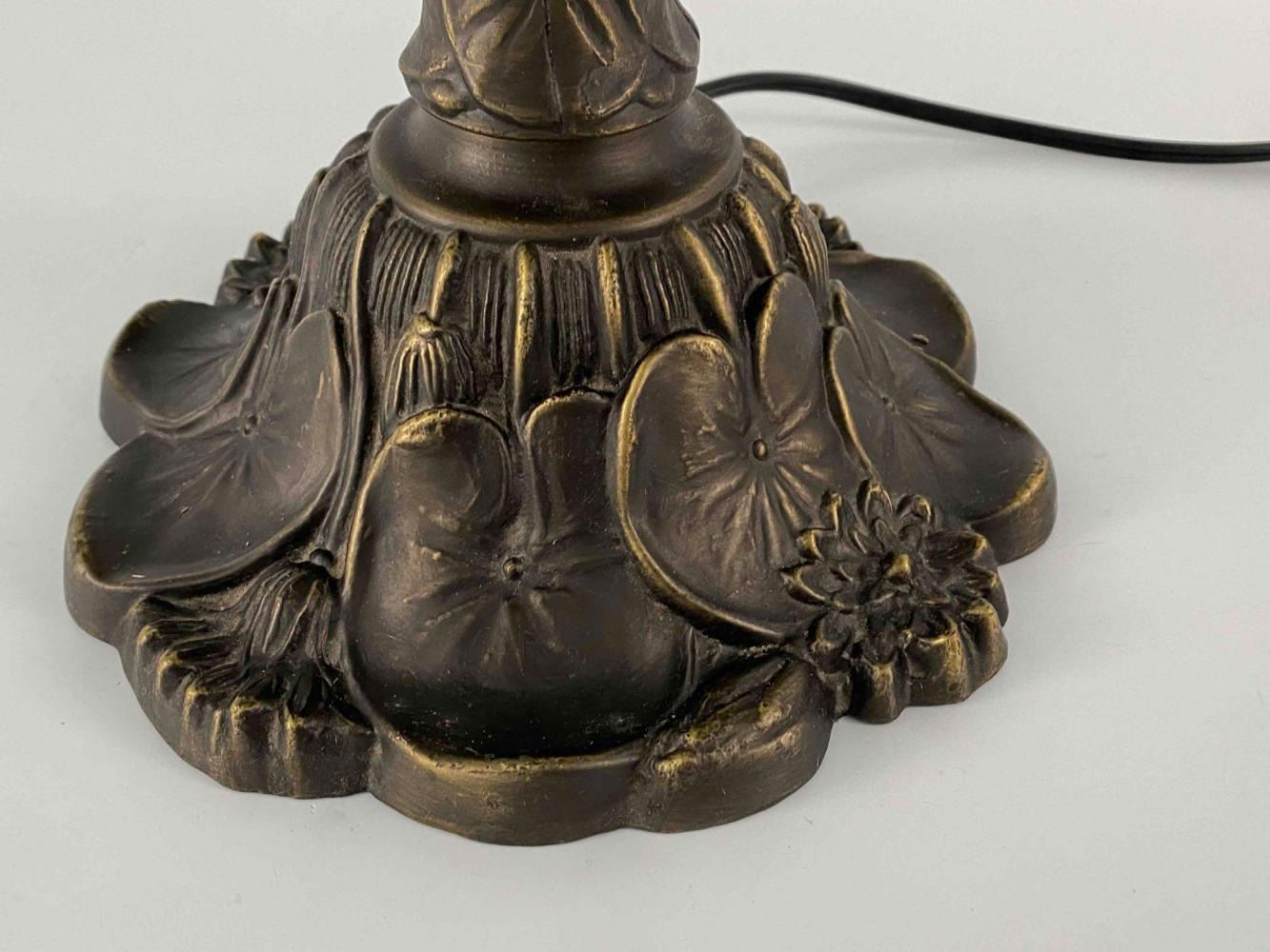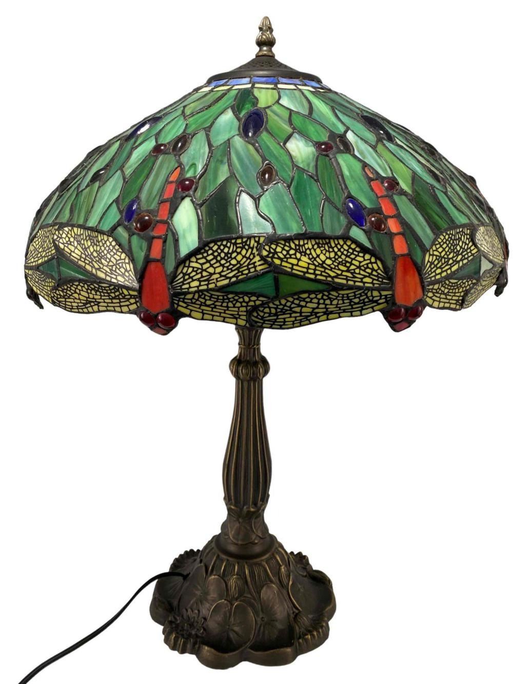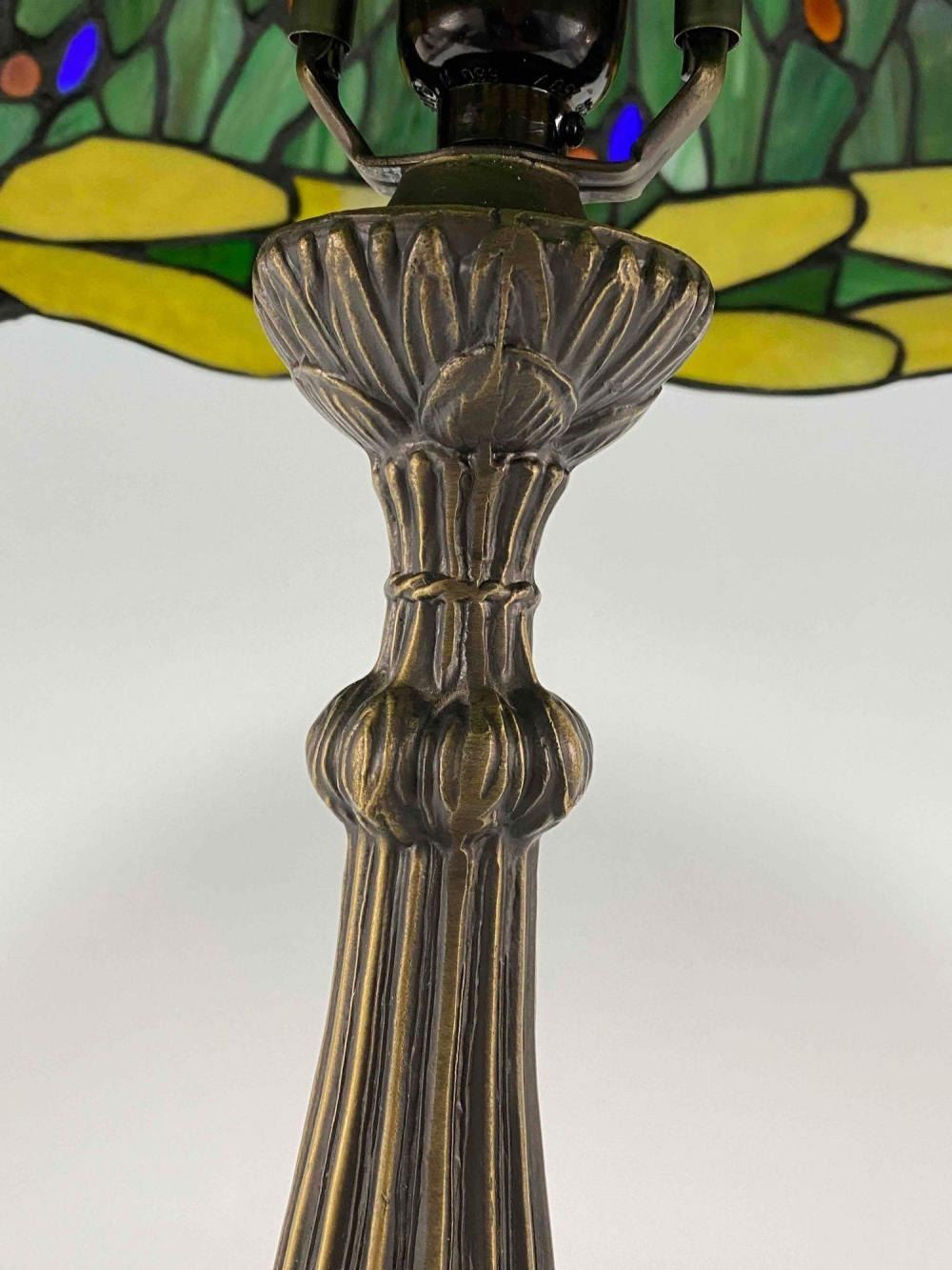 Stained Glass Bronze Table Lamp With Dragonfly And Water Lily Motif. Unmarked. Approximately 24.0H x 17.0D in.