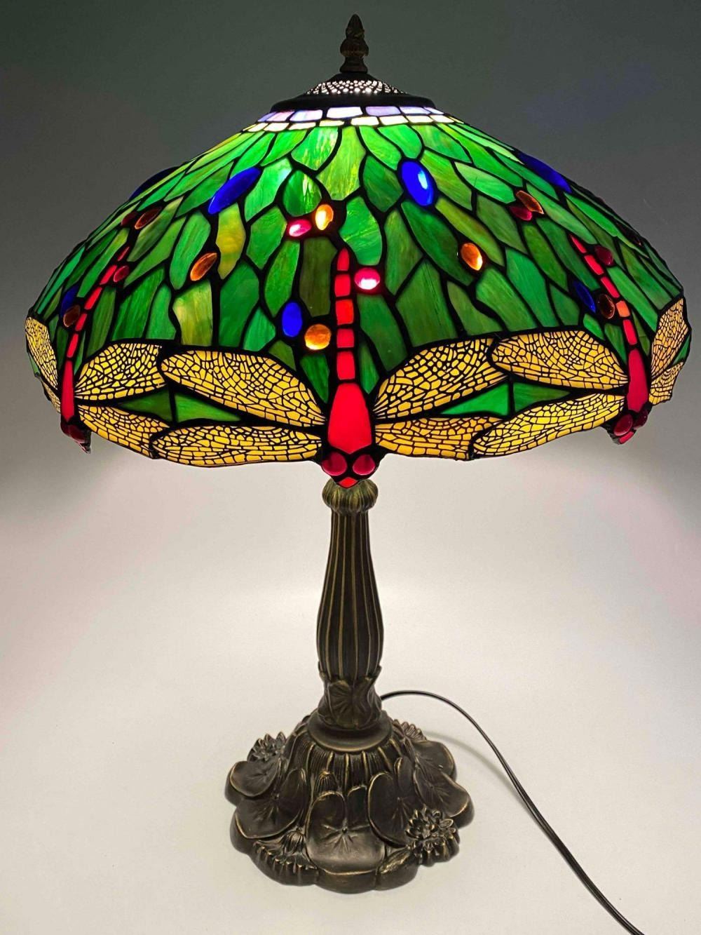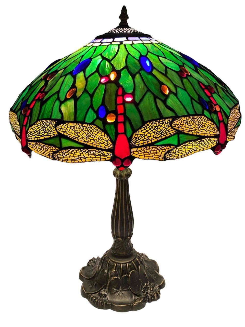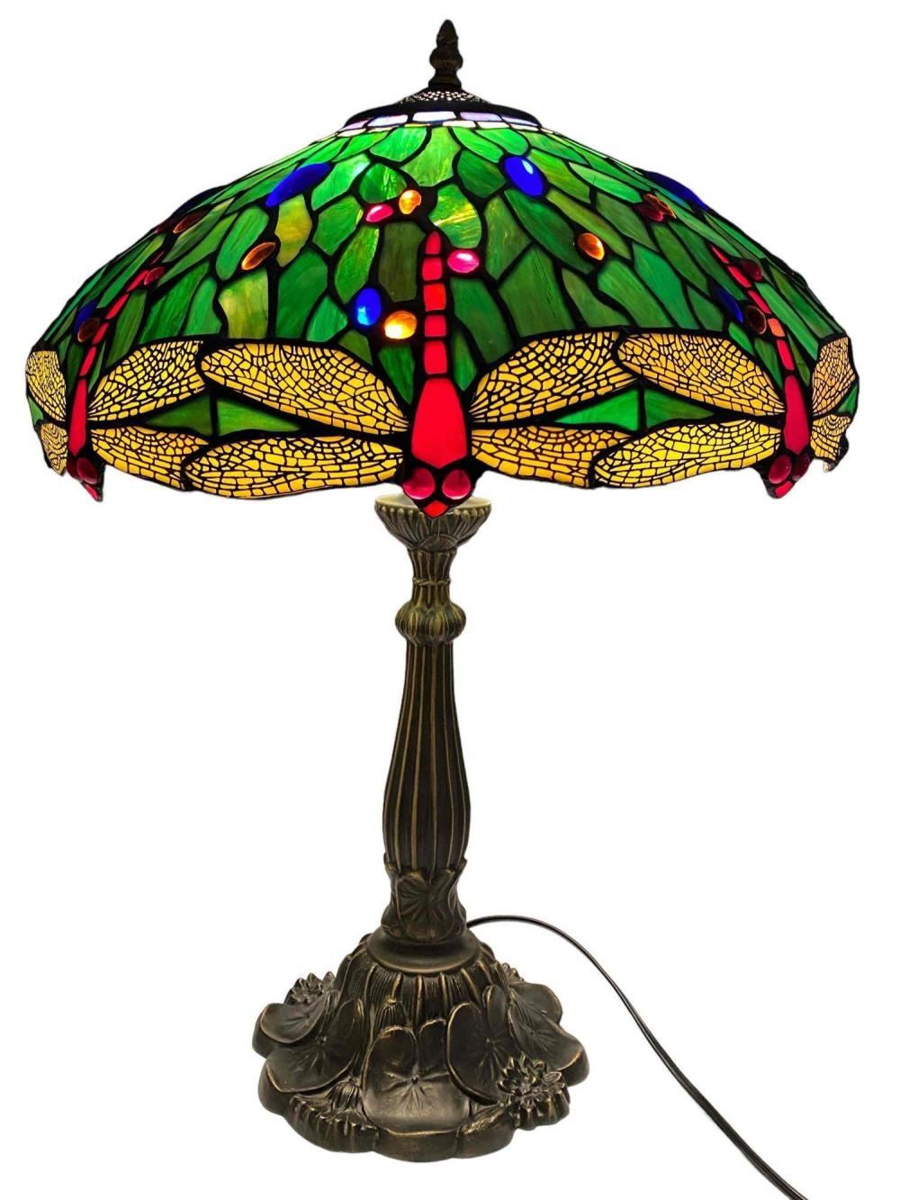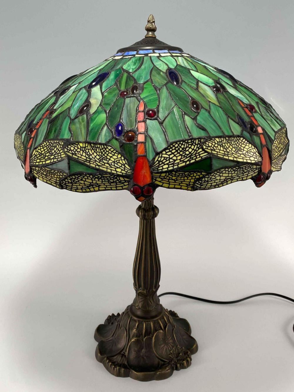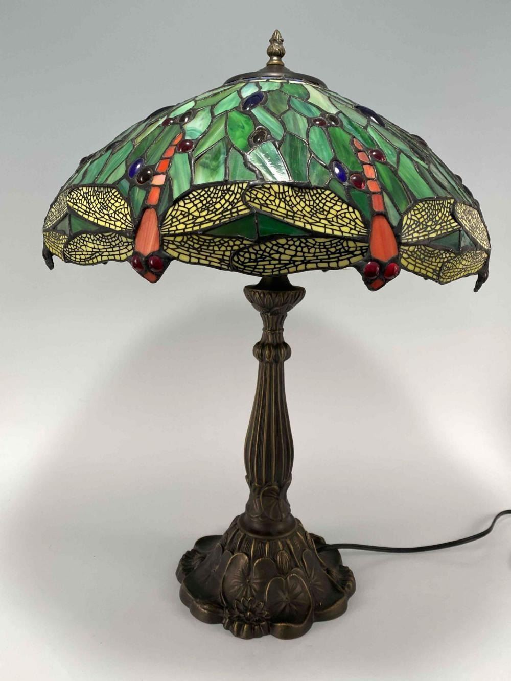 Stained Glass Bronze Table Lamp With Dragonfly And Water Lily Motif. Unmarked. Approximately 24.0H x 17.0D in.