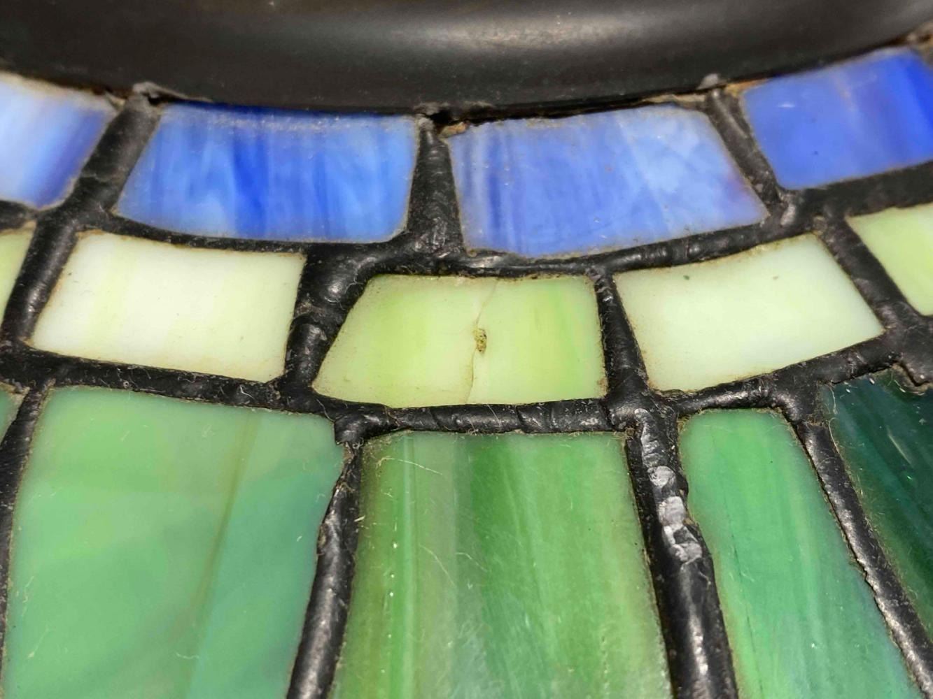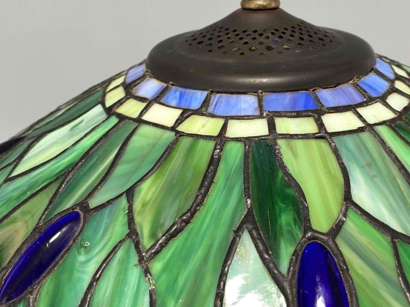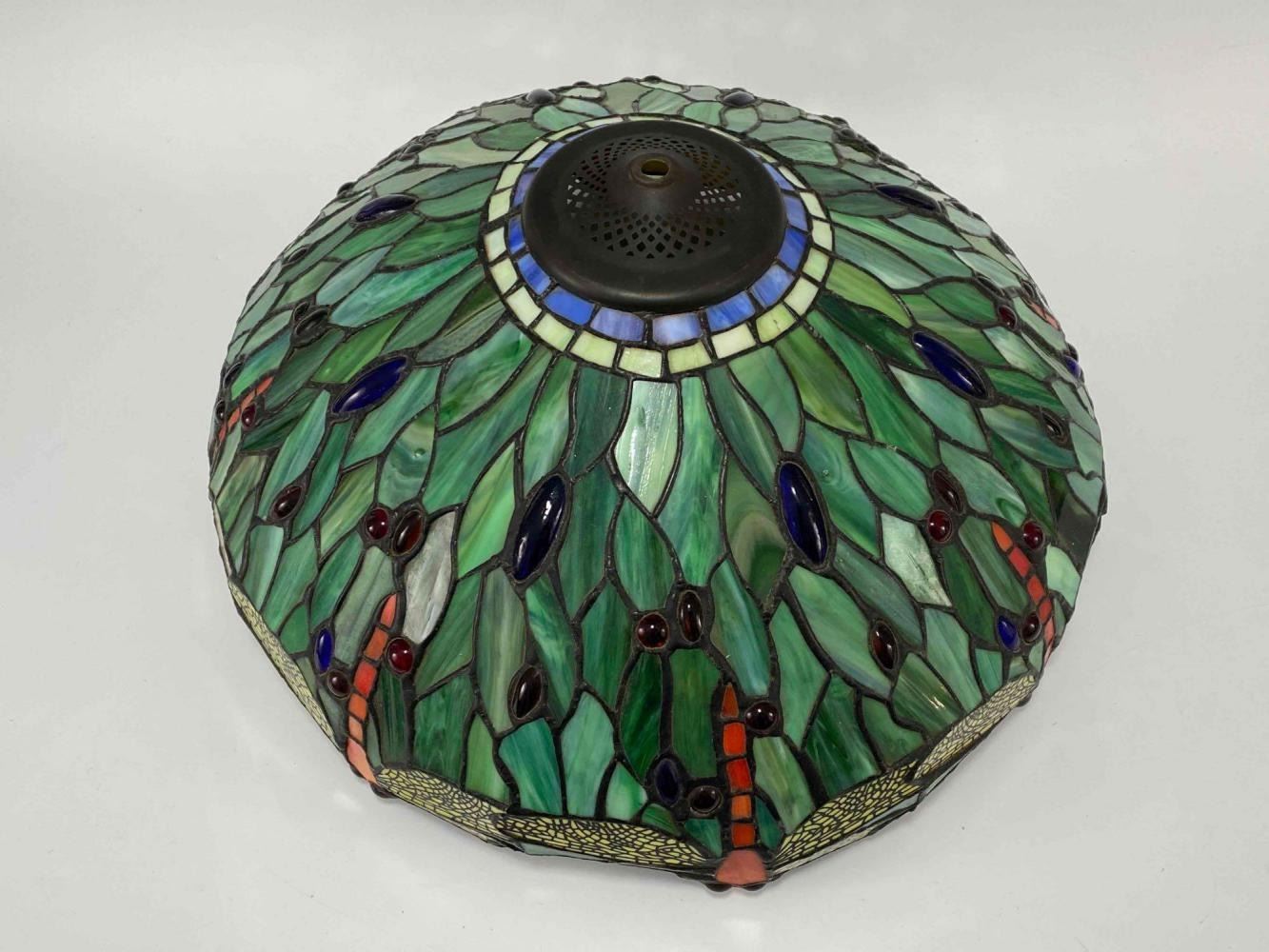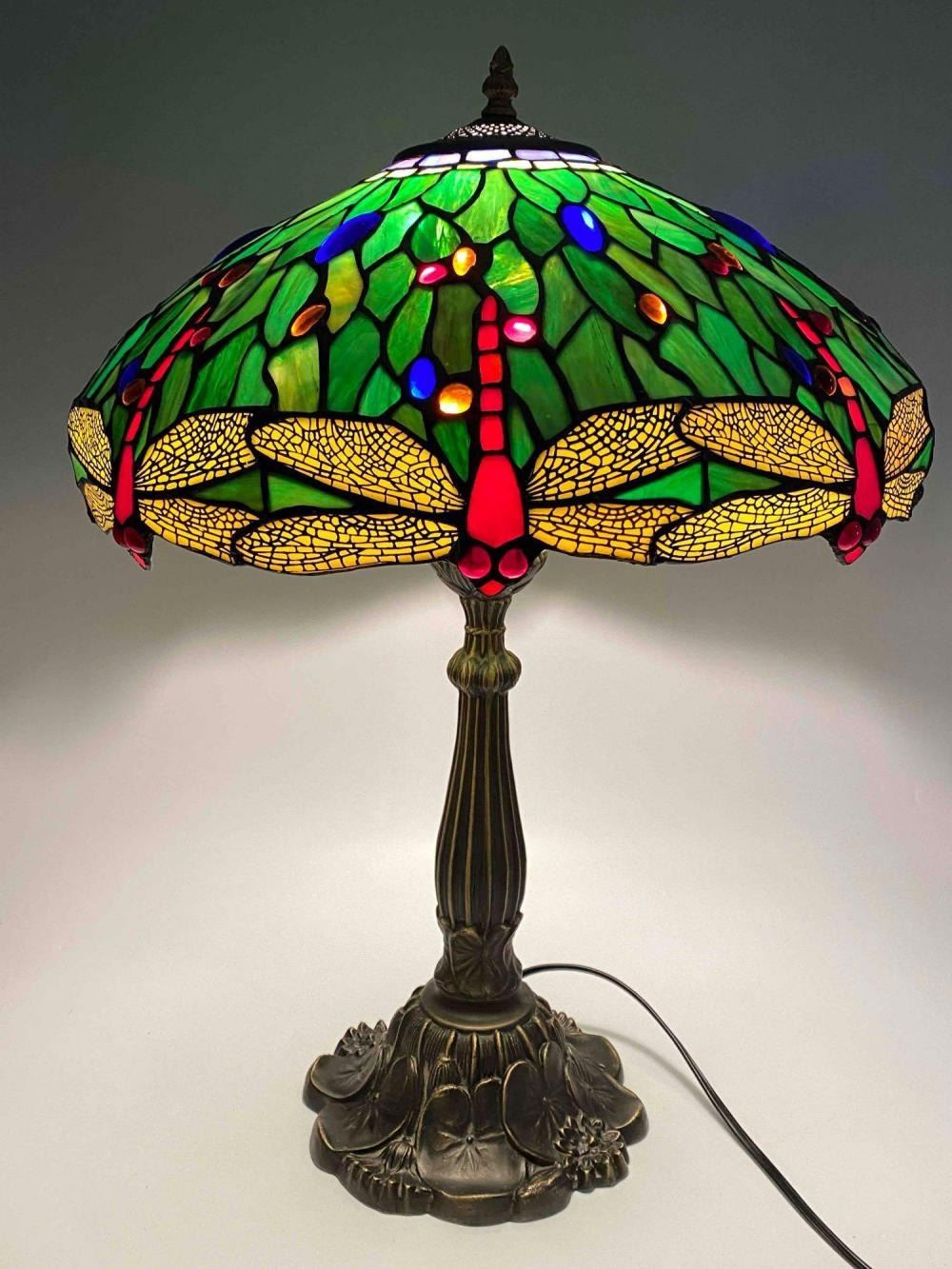 Stained Glass Bronze Table Lamp With Dragonfly And Water Lily Motif. Unmarked. Approximately 24.0H x 17.0D in.