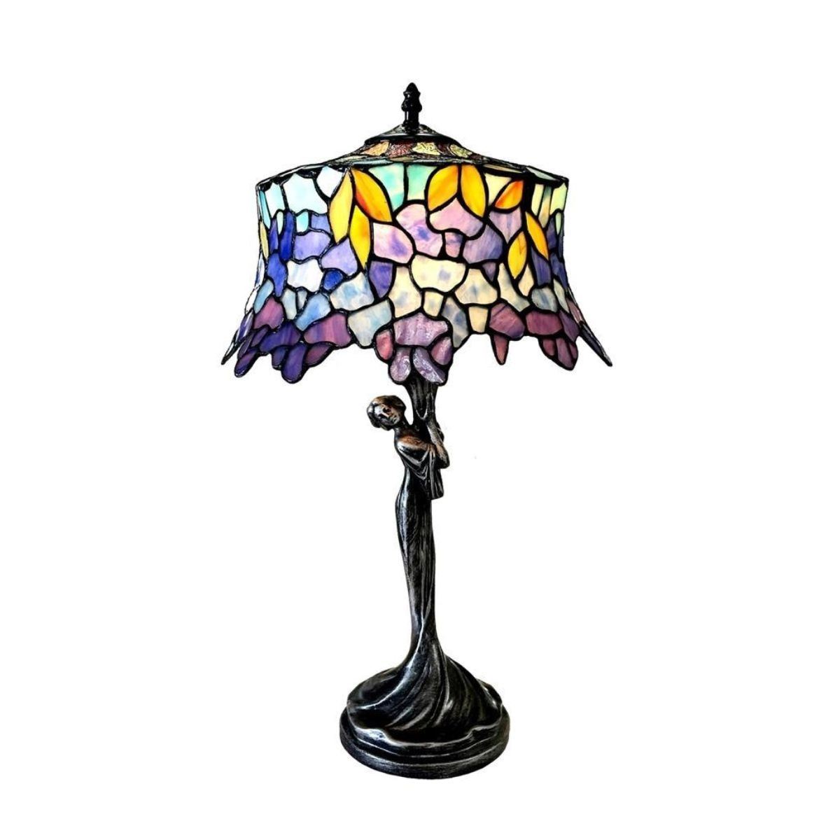 Tiffany-style stained art glass lamp, lady under canopy of wisteria. 33 glass cuts, wrapped in copper foil, with antique bronze finish. 22" H X Â 13" W shade.