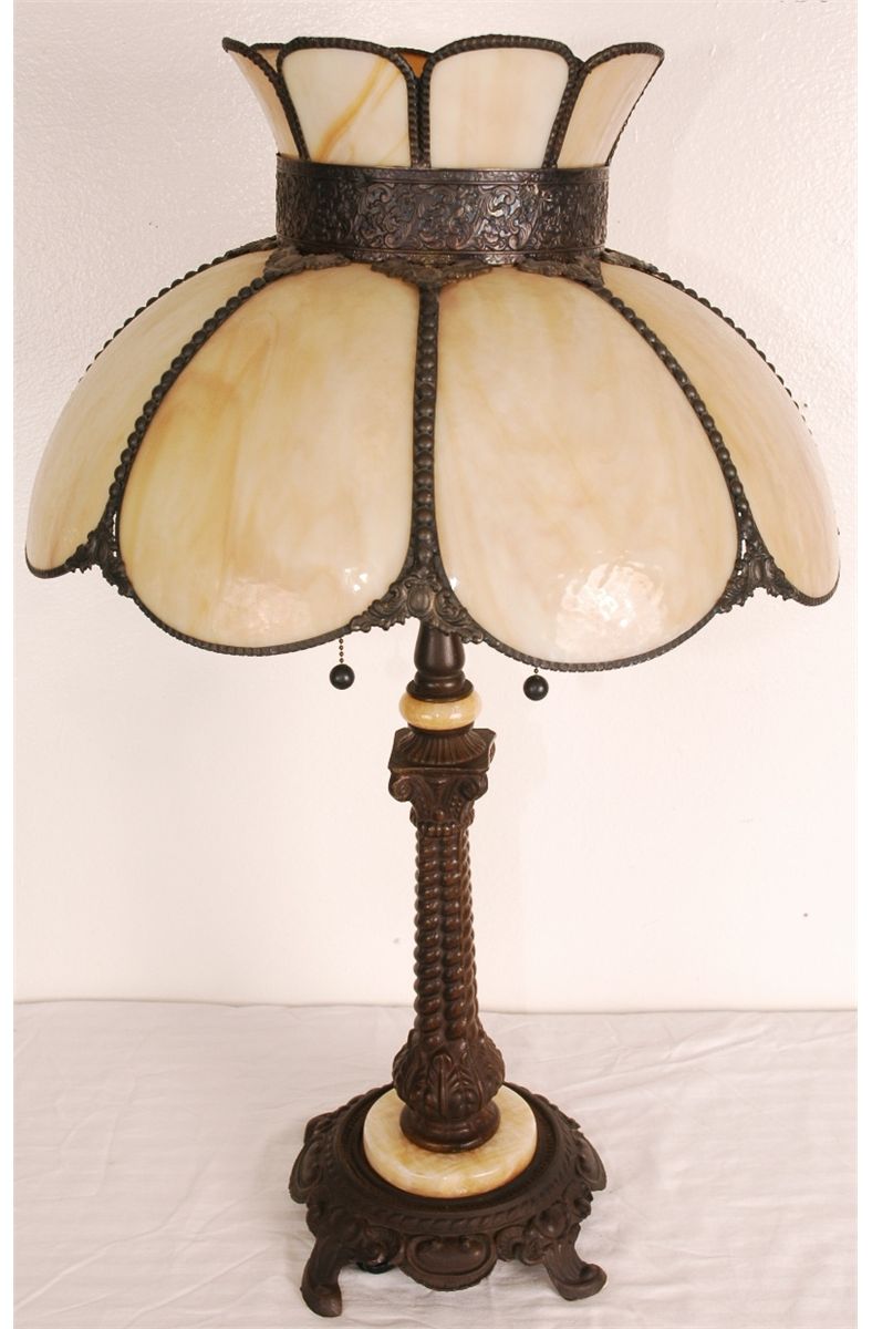 Cream colored stained glass and bronze Tiffany style lamp with cream colored marble accented bronze base. Double lighting feature with double pull chains. 30"H x 17"D Two glass panes have slight fissures but it is unnoticeable to the naked eye. Otherwise in excellent condition.