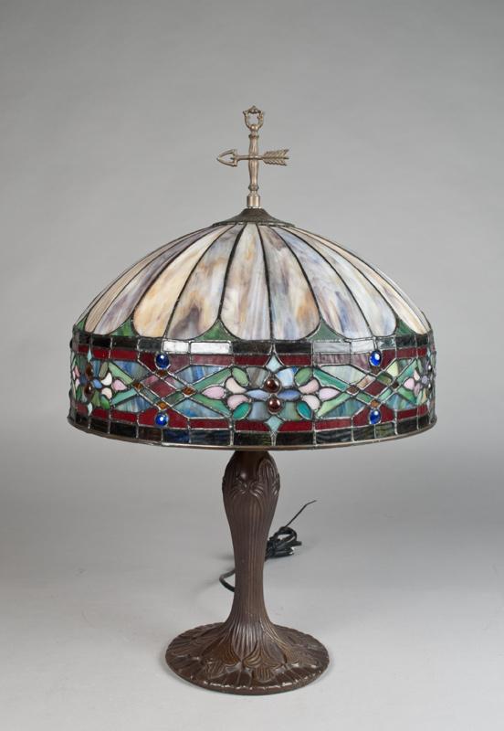 Leaded base lamp with colorful paneled shade with additions of beading and a directional finial. 25" H.