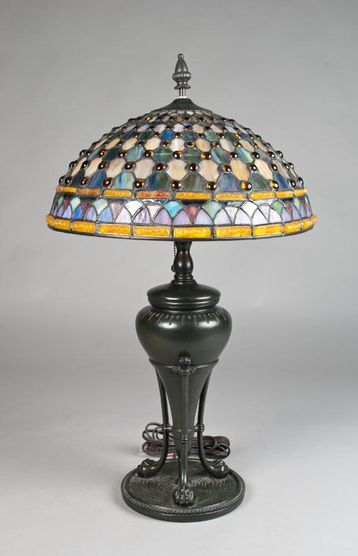 Painted dish base with three claw feet and colorful shade with beading in amber. 27" H x 16" W.
