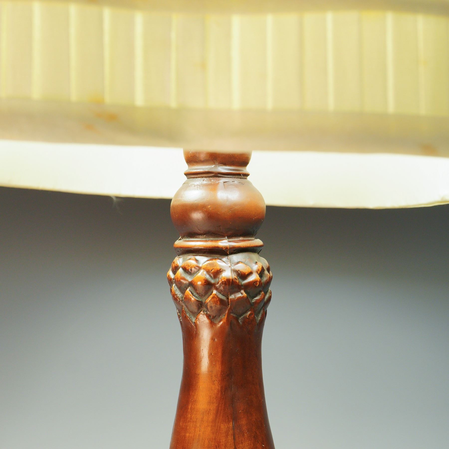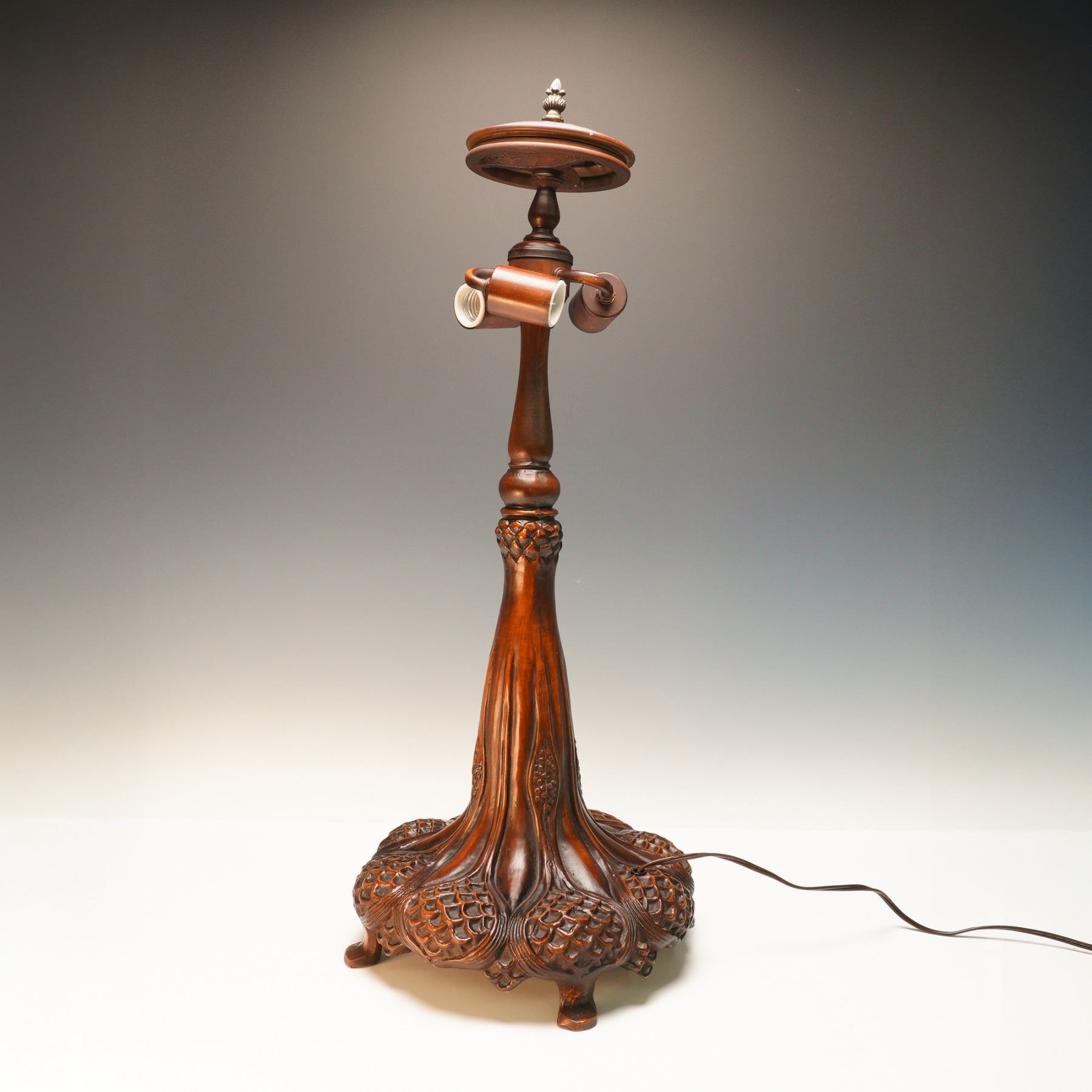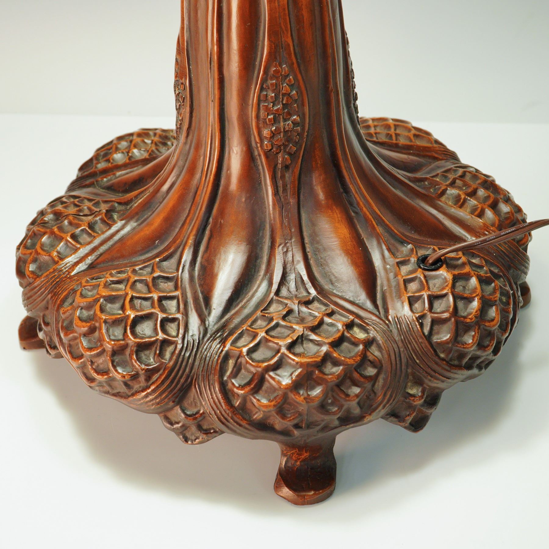 An elegant Tiffany style table lamp with a sculpted base inspired by Art Nouveau design. Standing 28 inches high and 11 inches in diameter, the form features flowing vertical lines, stylized botanical reliefs, and a flared base with pinecone or pomegranate-like motifs. The rich reddish-brown finish highlights the hand-carved detailing. A pierced metal shade cap and ornate finial complete the look, along with a pleated cream fabric shade. Electrified. Unmarked.
