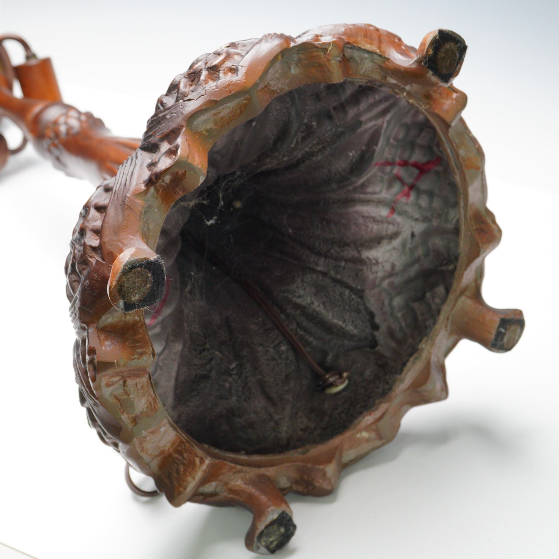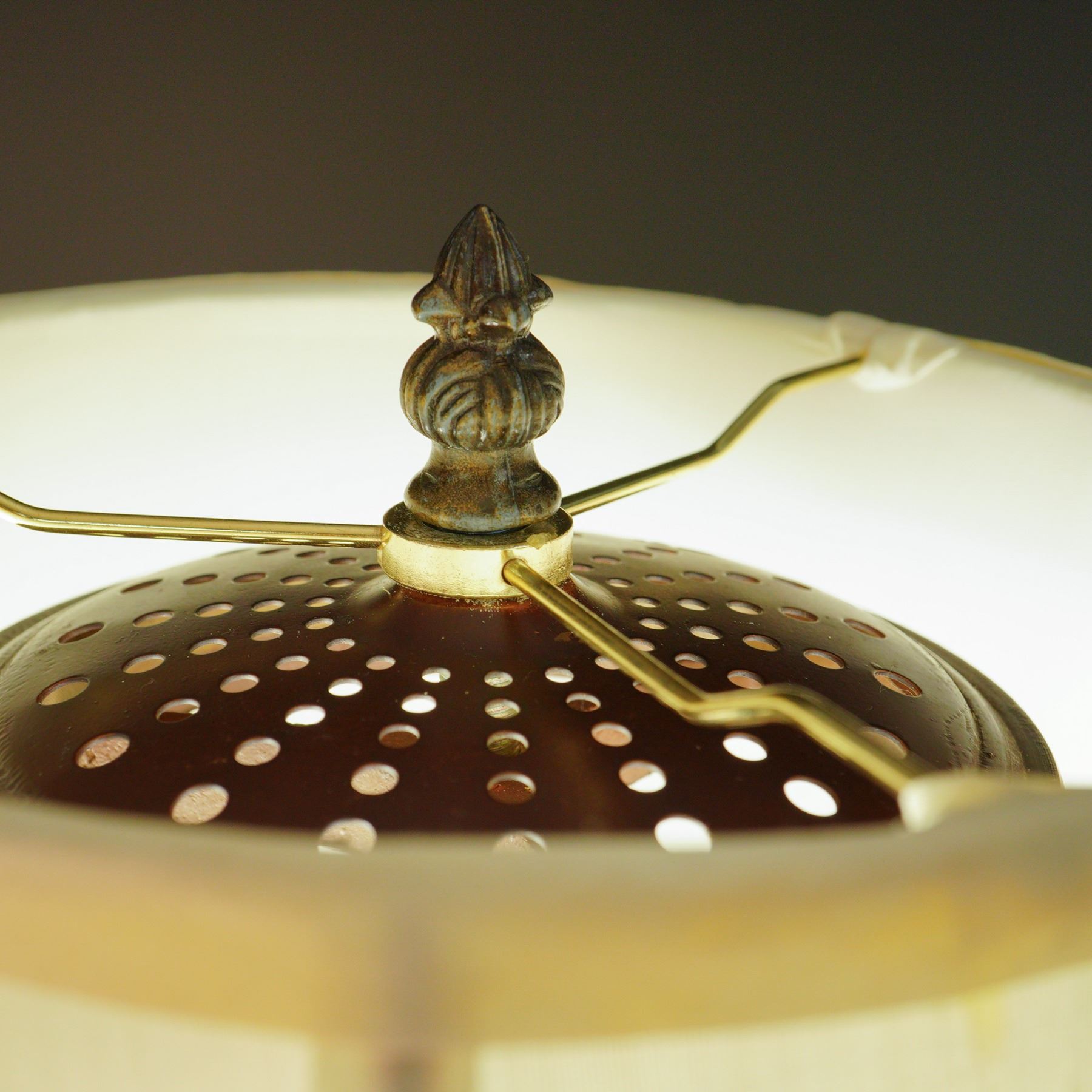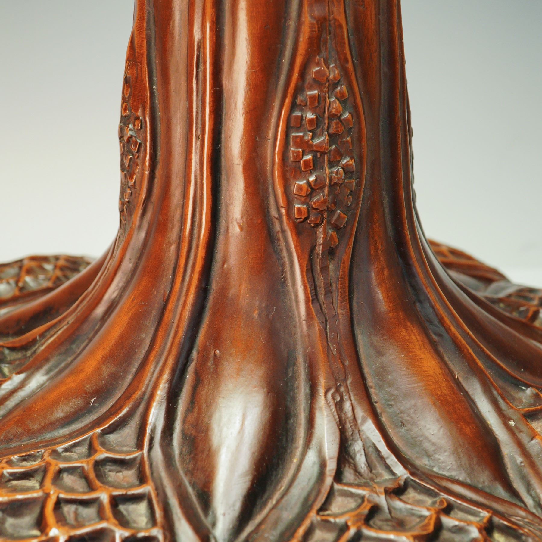 An elegant Tiffany style table lamp with a sculpted base inspired by Art Nouveau design. Standing 28 inches high and 11 inches in diameter, the form features flowing vertical lines, stylized botanical reliefs, and a flared base with pinecone or pomegranate-like motifs. The rich reddish-brown finish highlights the hand-carved detailing. A pierced metal shade cap and ornate finial complete the look, along with a pleated cream fabric shade. Electrified. Unmarked.