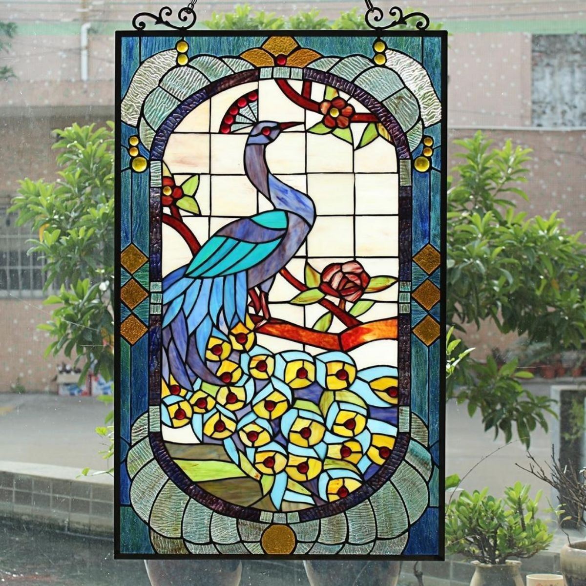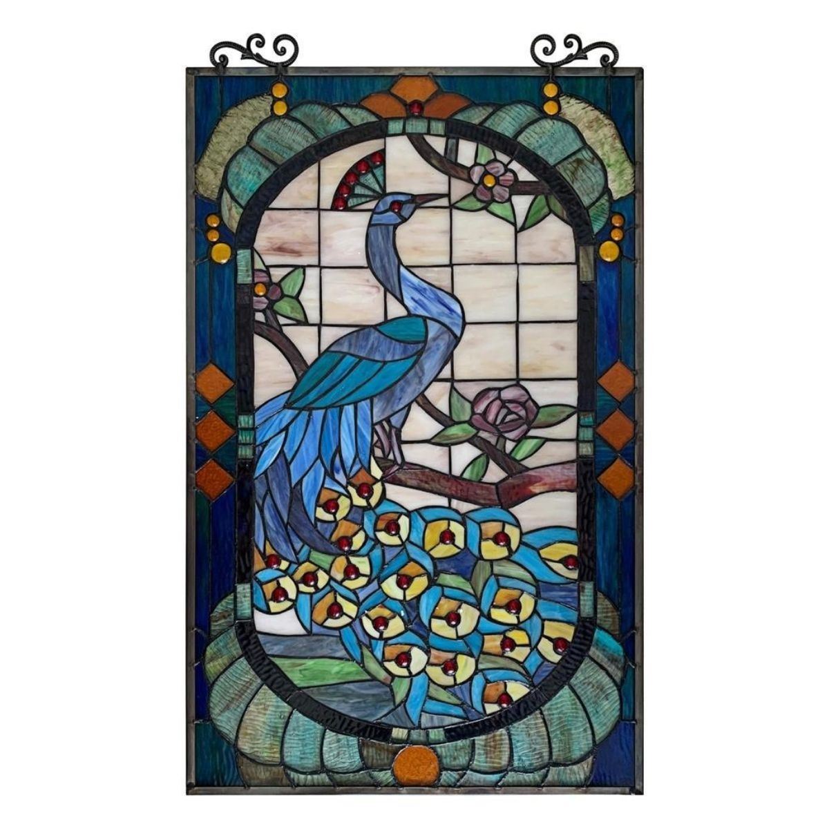 Tiffany-style peacock stained glass hanging window panel, with 338 pieces of stained art glass & 40 glass beads, wrapped in copper foil. 33" H X 20" W. Comes with hanging chain.Â