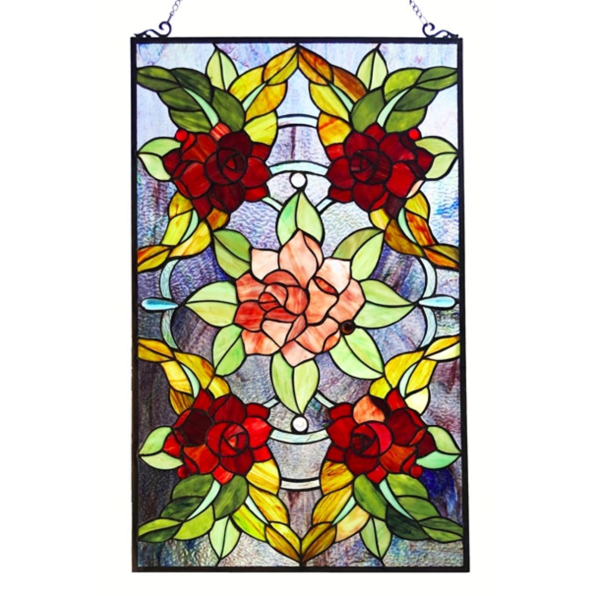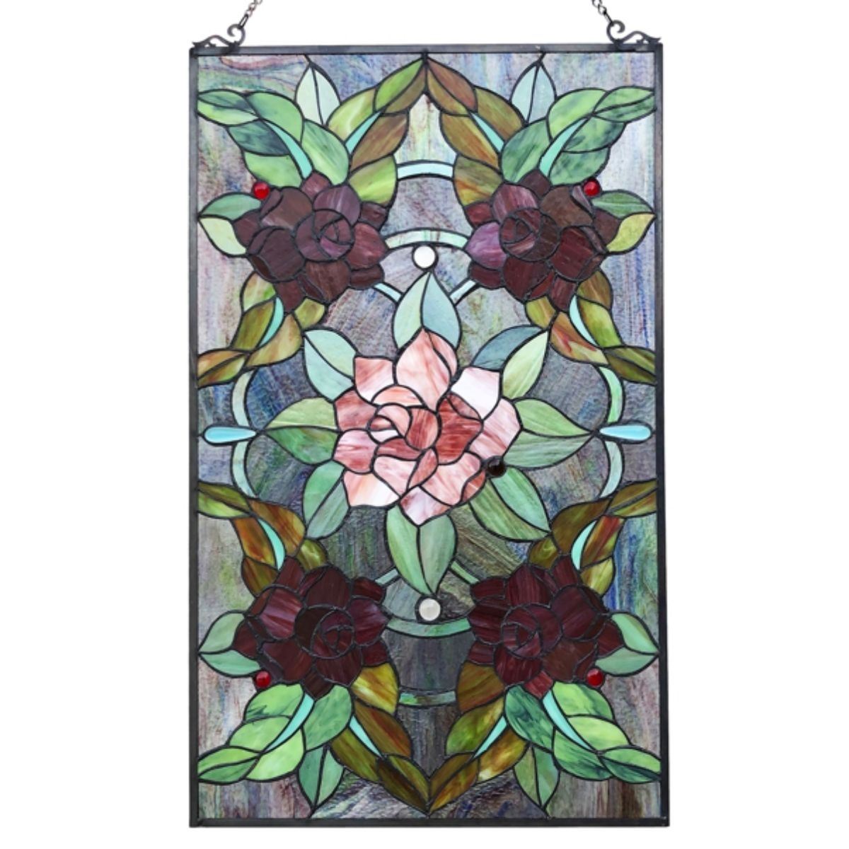 Tiffany-style stained art glass hanging window panel of roses. Created using over 300 pieces of stained art glass & glass beads, wrapped in copper foil. 32" H X 20" W. Comes with hanging chain.Â