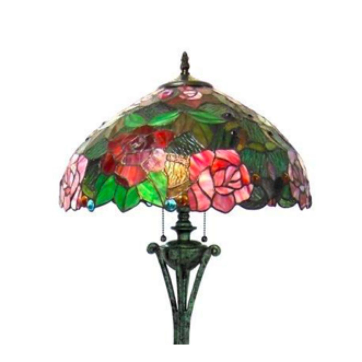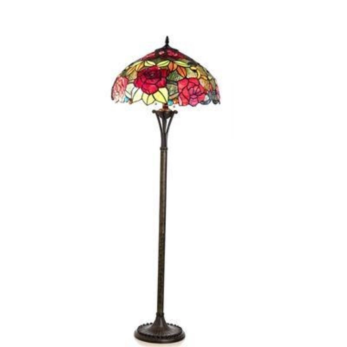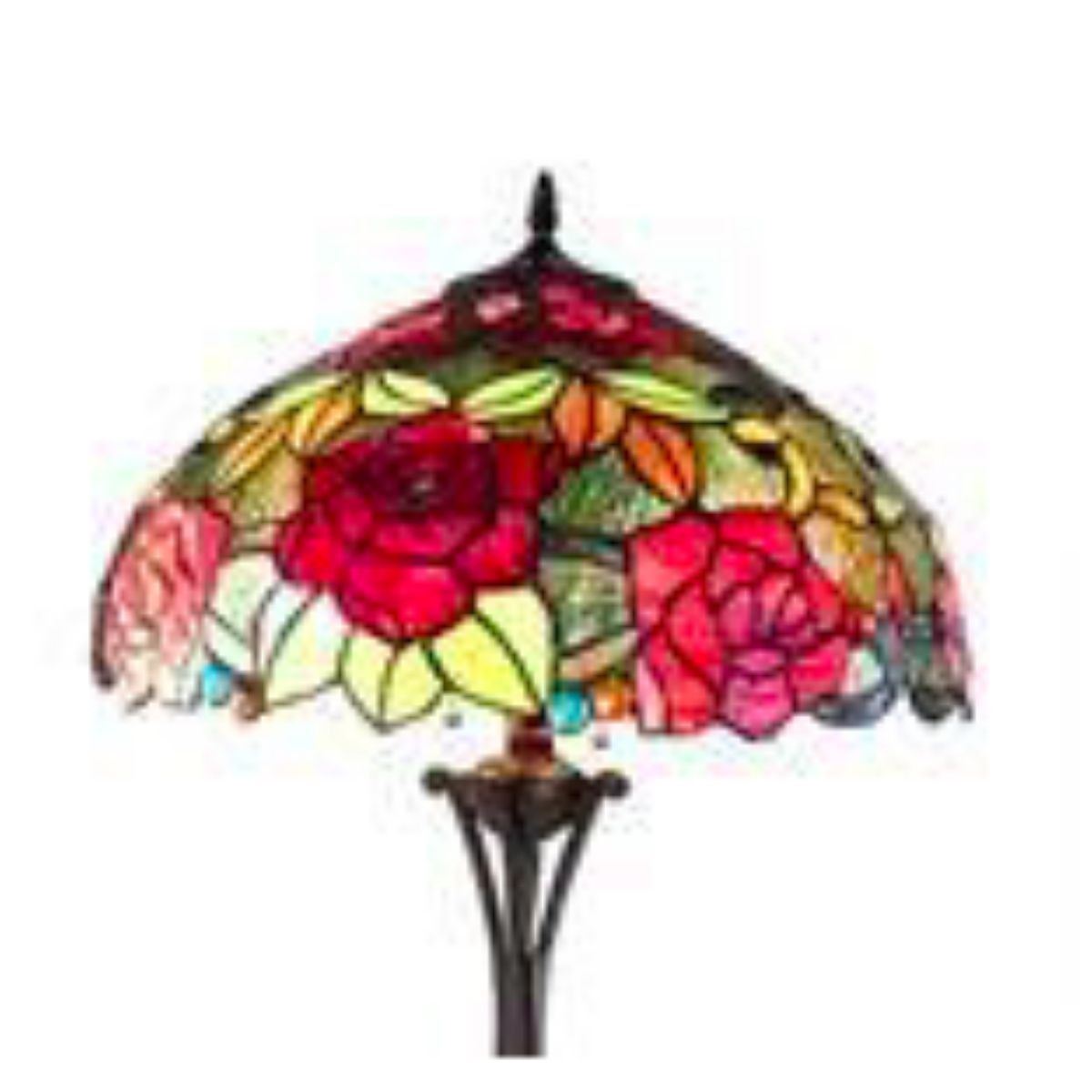 Tiffany-style Roses stained art glass floor lamp. Created using 456 pieces of stained art glass & 36 glass beads, wrapped in copper foil with dark antique bronze finish. 64" H X 18" W shade.Â
