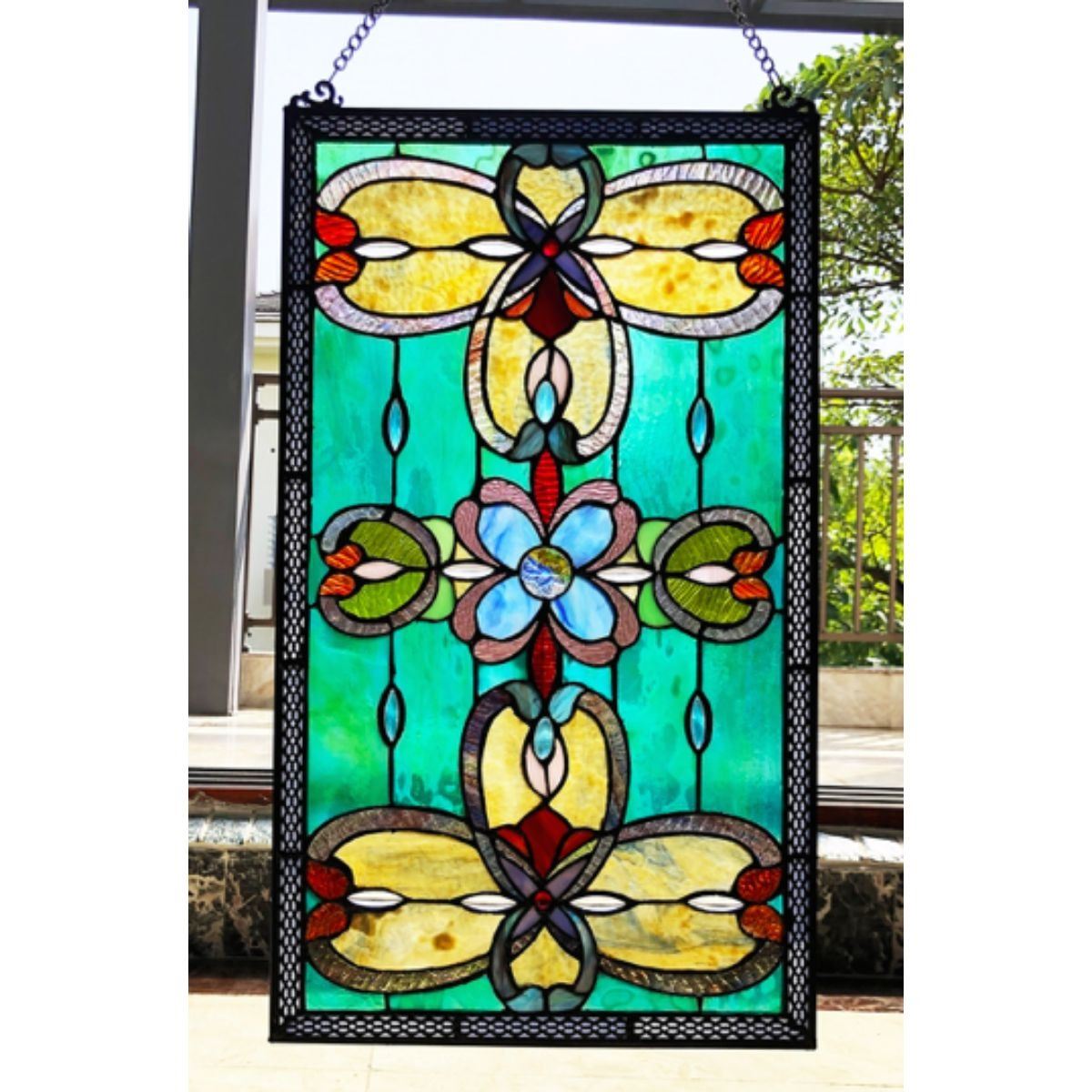 Created from 170 pieces of stained art glass, with 17 glass beads, wrapped in copper foil & soldered together into a lovely teal colored hanging window panel. 26" H X 15" W. Comes with hanging chain.Â