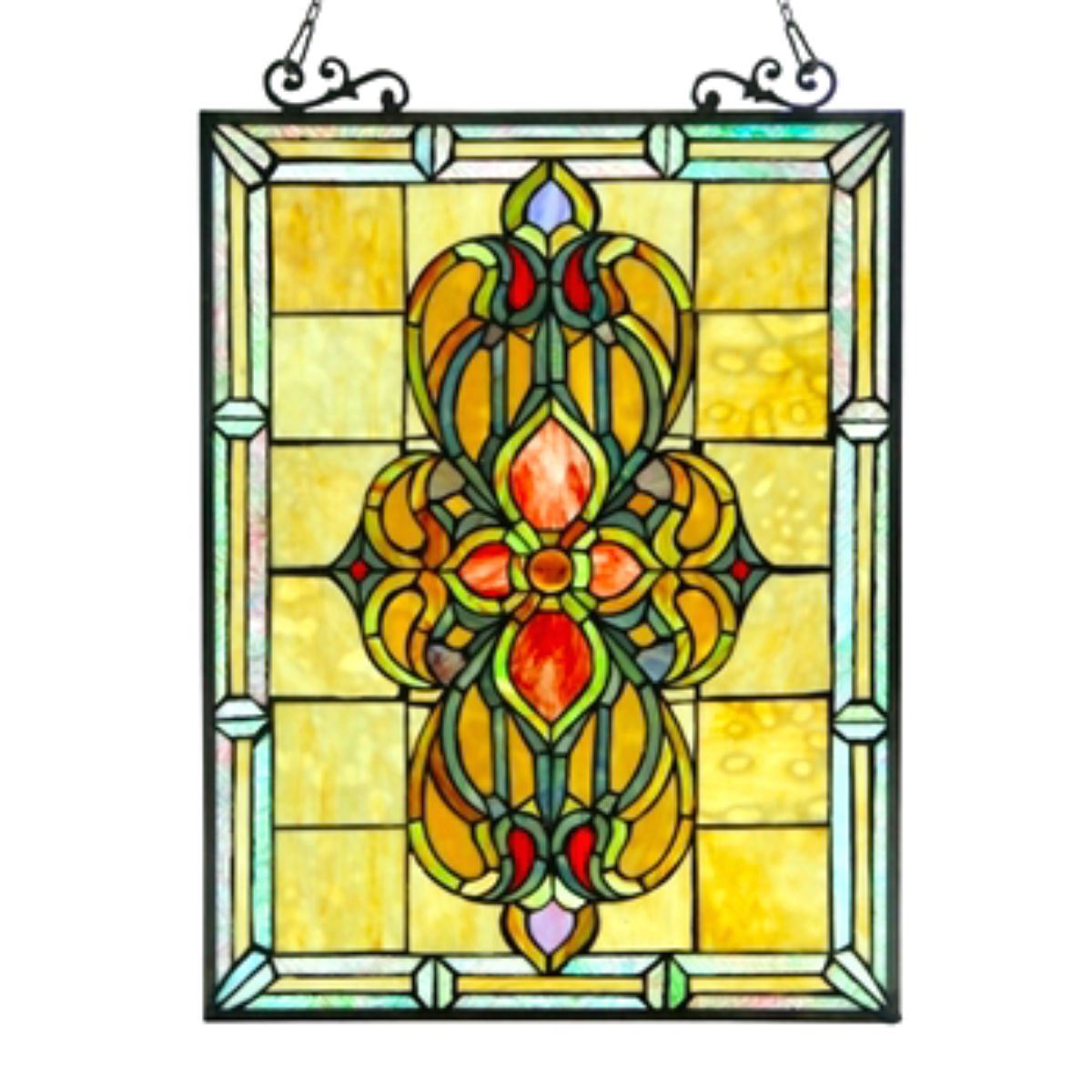 Tiffany-style stained art glass hanging window panel, created using 255 pieces of stained art glass & 1 glass bead, wrapped in copper foil with textured black finish. 18 1/2" X 25 1/2". Comes with hanging chain.Â