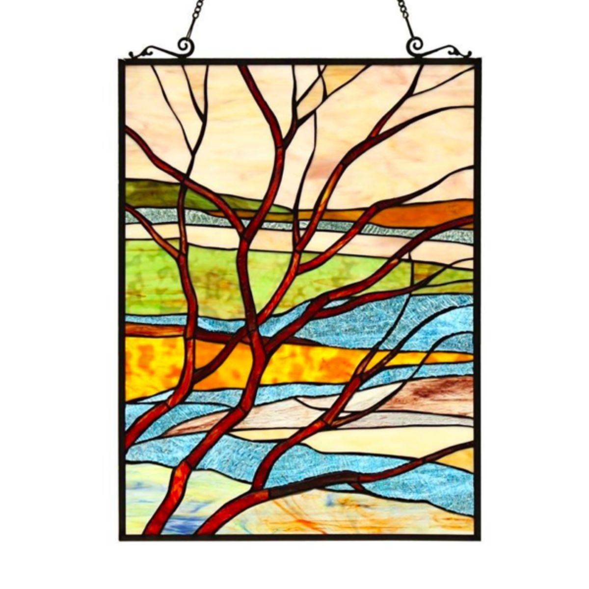 Tiffany-style stained glass window panel, a landscape river scene with branches. 137 glass cuts, wrapped in copper foil. 24" H X 17 1/2" W. Comes with hanging chain.Â