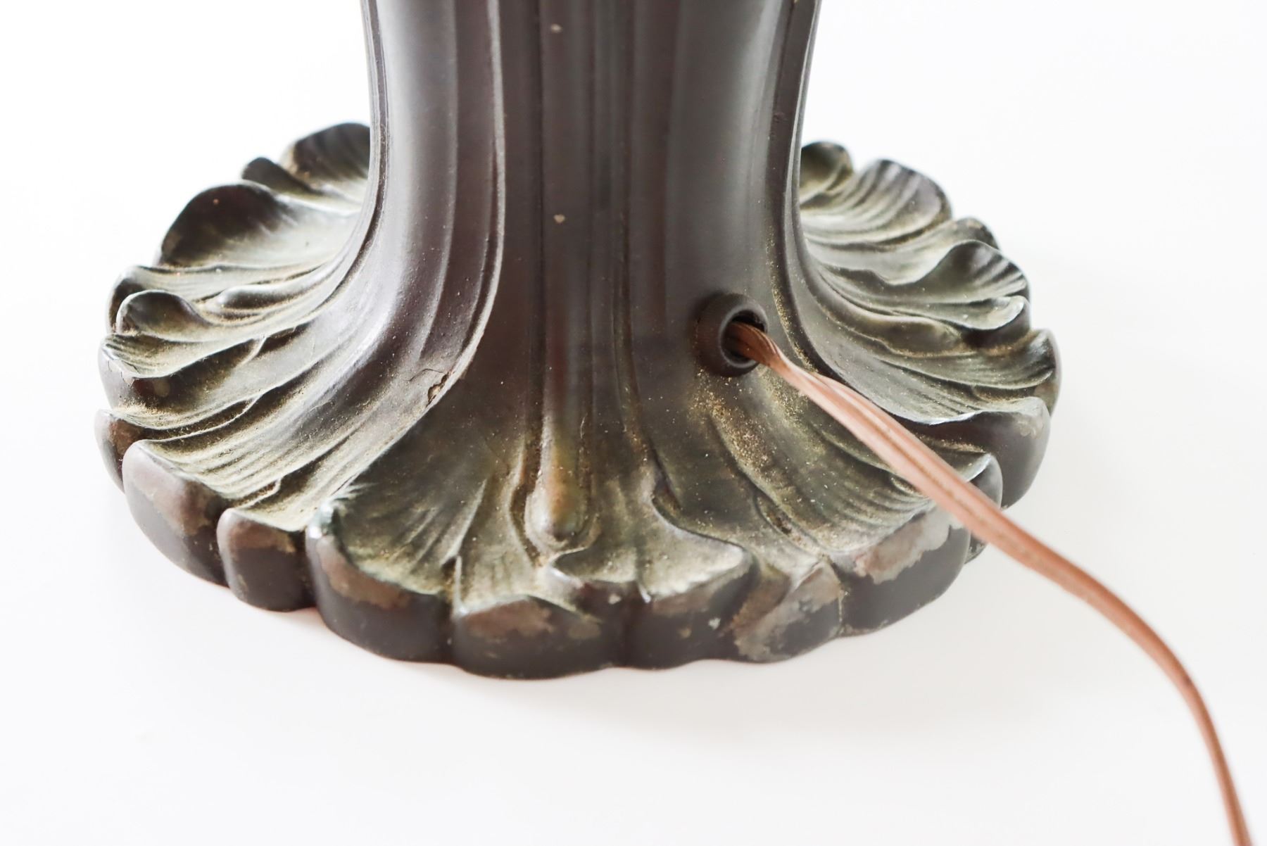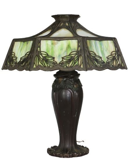 Beautiful green tint stained glass lamp, in the style of Tiffany & Co. Nice detailing on the shade and sturdy base. Commensurate with age. Size: 20 x 20 in.