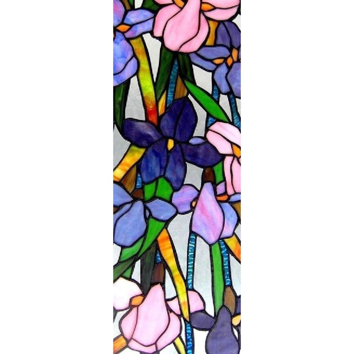 Iris flowers in bloom, stained glass Tiffany-style multi-color window panel, vintage reproduction of an original Louis Comfort Tiffany design. 32" H.