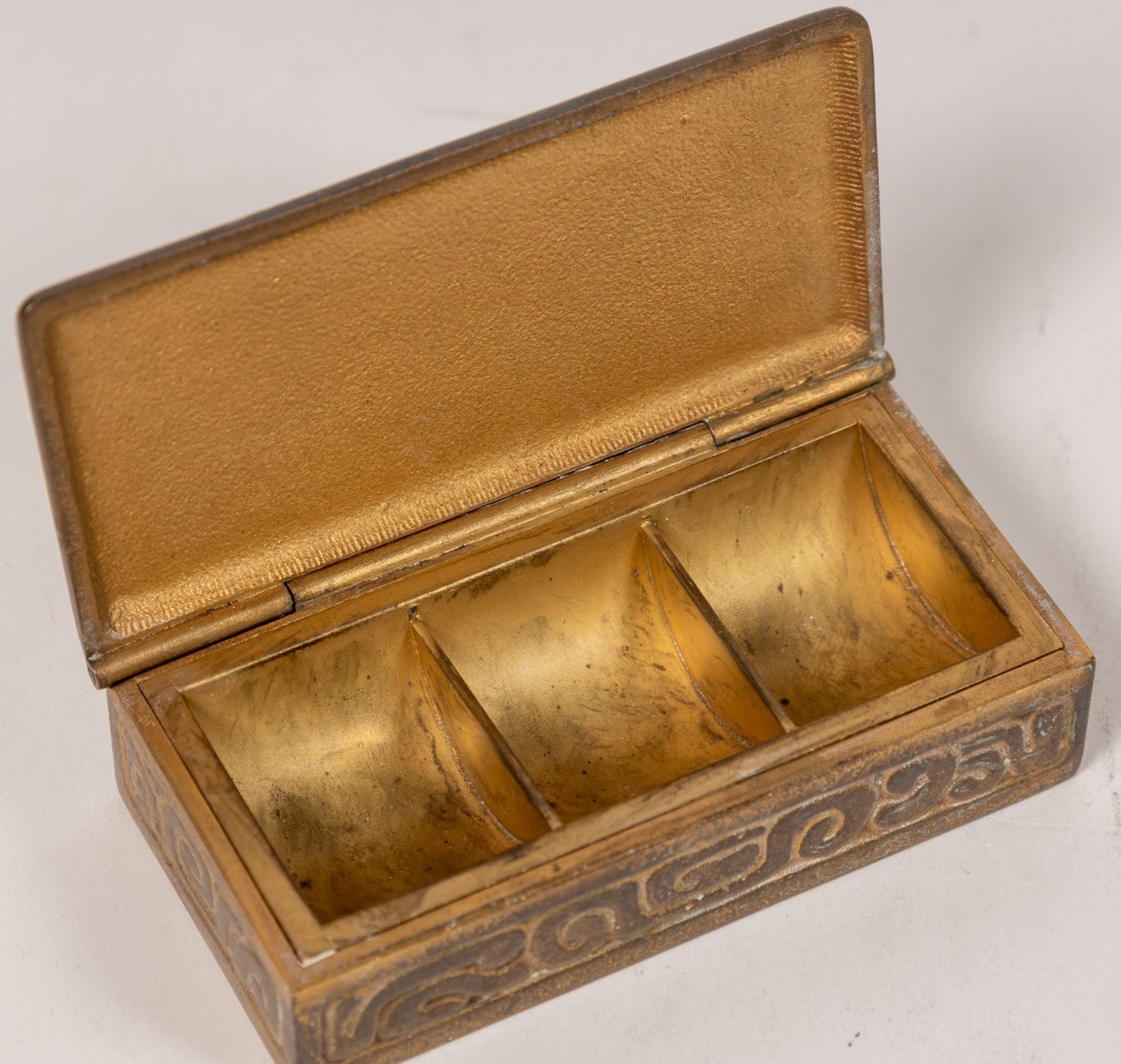 In the early 1900s Louis Comfort Tiffany designed 24 different patterned desk-sets. The pieces were sold individually, to meet the needs of customers. While some of the more basic pieces are still relatively easy to find, as many as 80 different pieces were made in the most prolific patterns like Pine Needle and Zodiac, making the rarest of those extremely collectible. Nearly 1000 different set pieces were produced between 1900 and 1933 in all patterns combined. (Ref: Tiffany Desk Sets; 2008, William R. Holland) Tiffany Studios, New York, Zodiac pattern presents the 12 signs of the Zodiac. According to Holland, former U.S. President G. H. W. Bush chose the Zodiac pattern for his Presidential desk set. The pattern was affordable, offered the widest variety of pieces to choose from and came in 12 different finishes, such as gold, copper, brown, green, silver plate and others. There is great variation in patinas and finishes, and changes were made in the chemical and metallurgical processes over a 30+ year period, making it nearly impossible to specify the exact finish for every piece. Please examine photos carefully. Please see online catalog for dimensions and rarity ratings. City: State: Date:c1900-1933