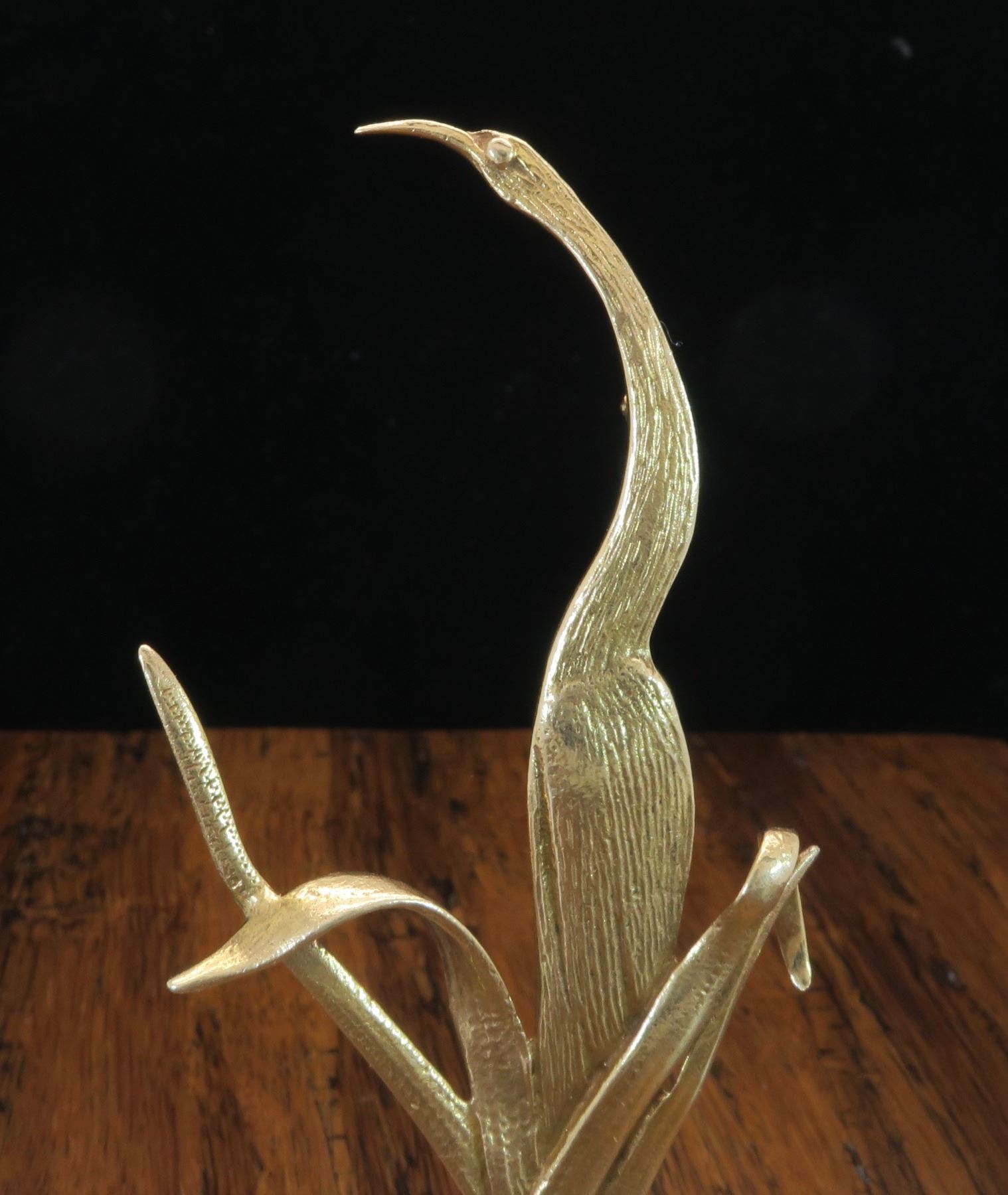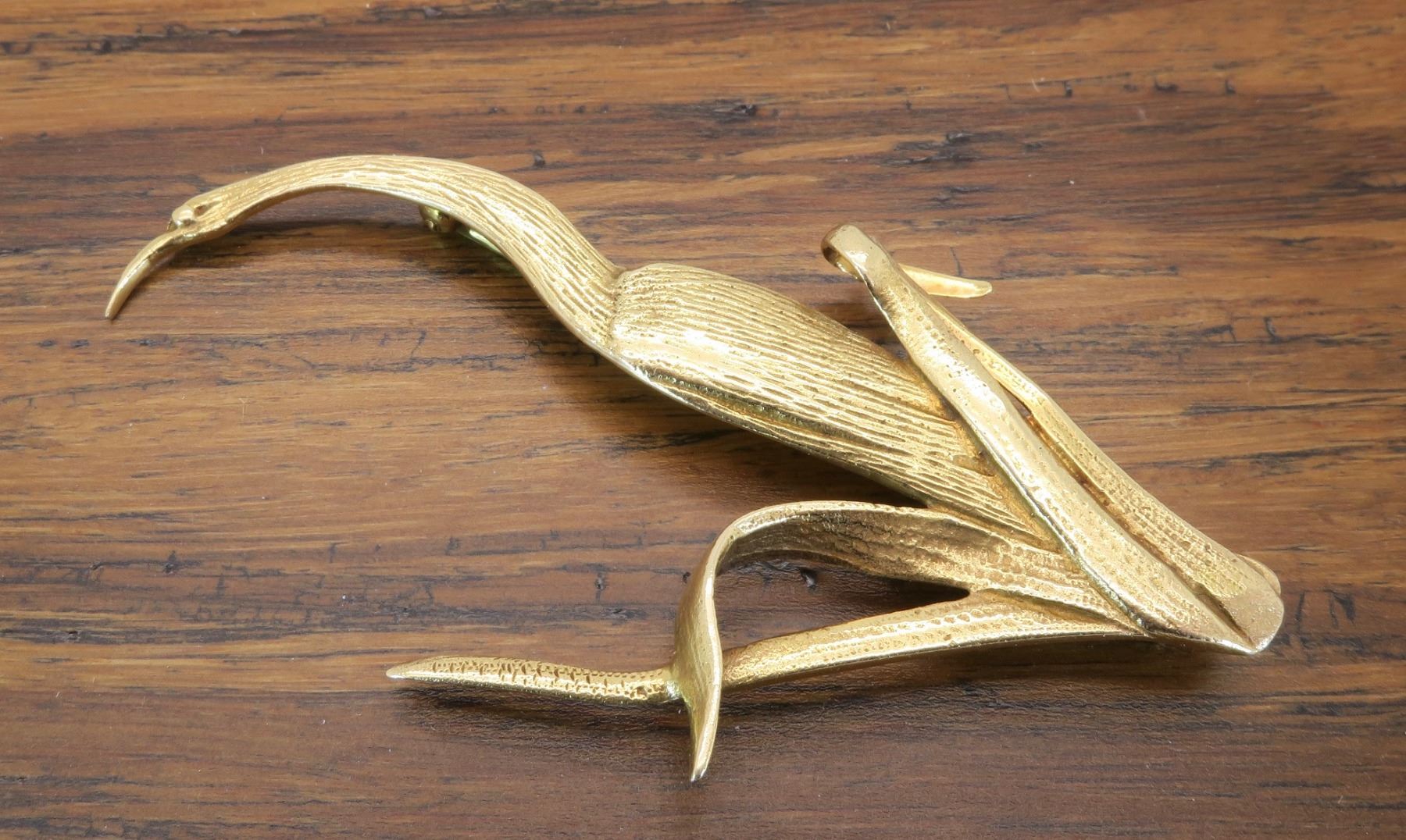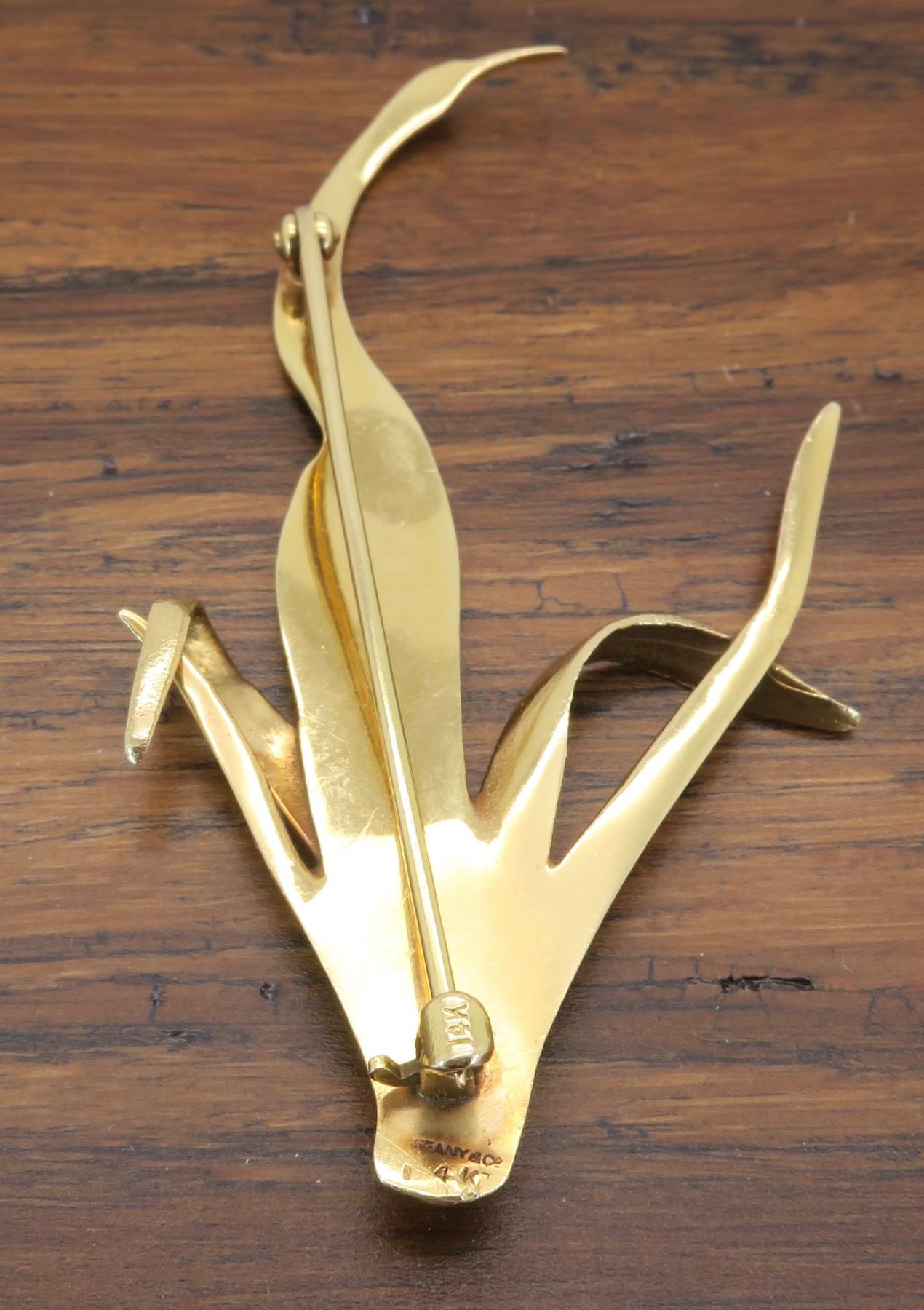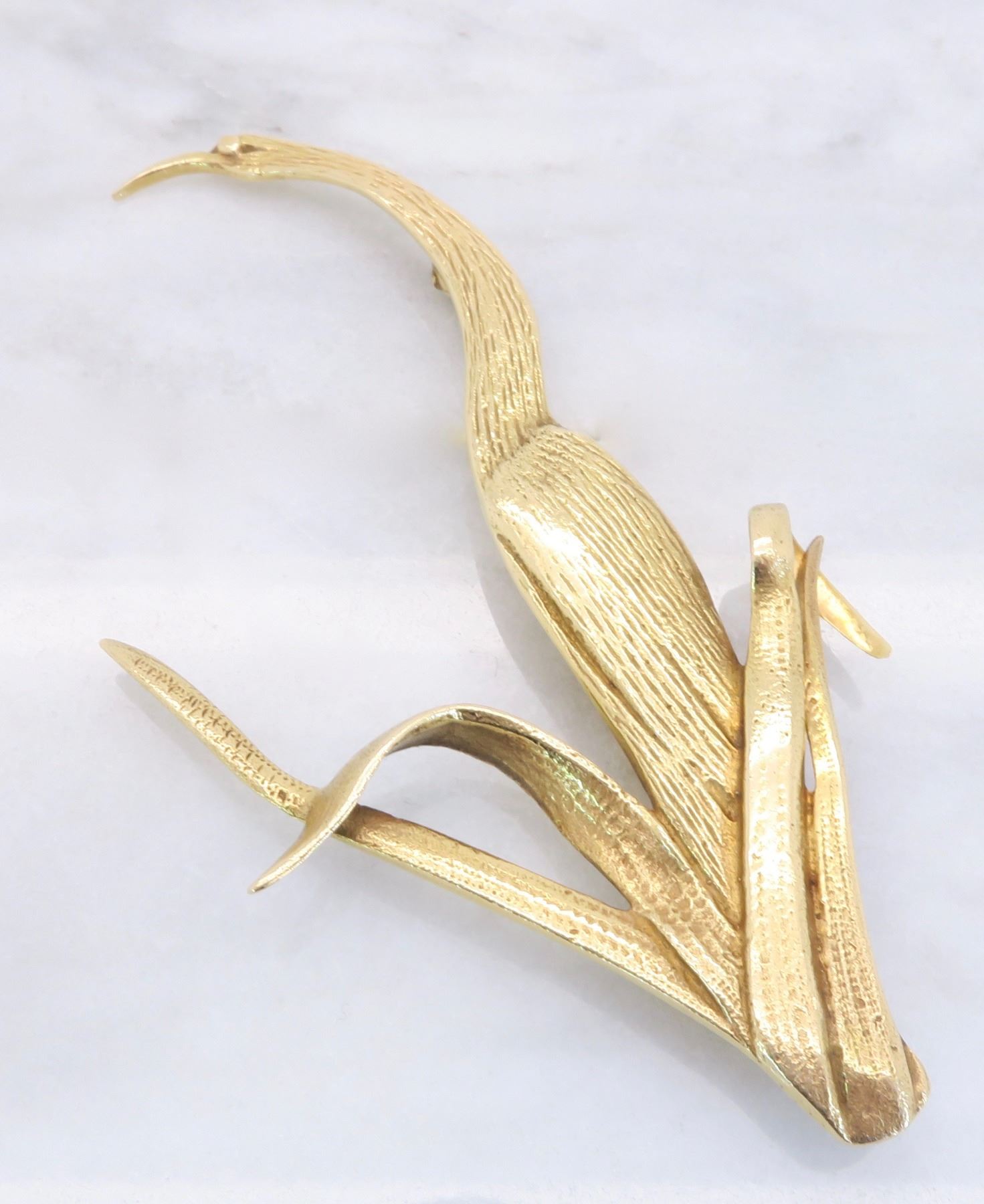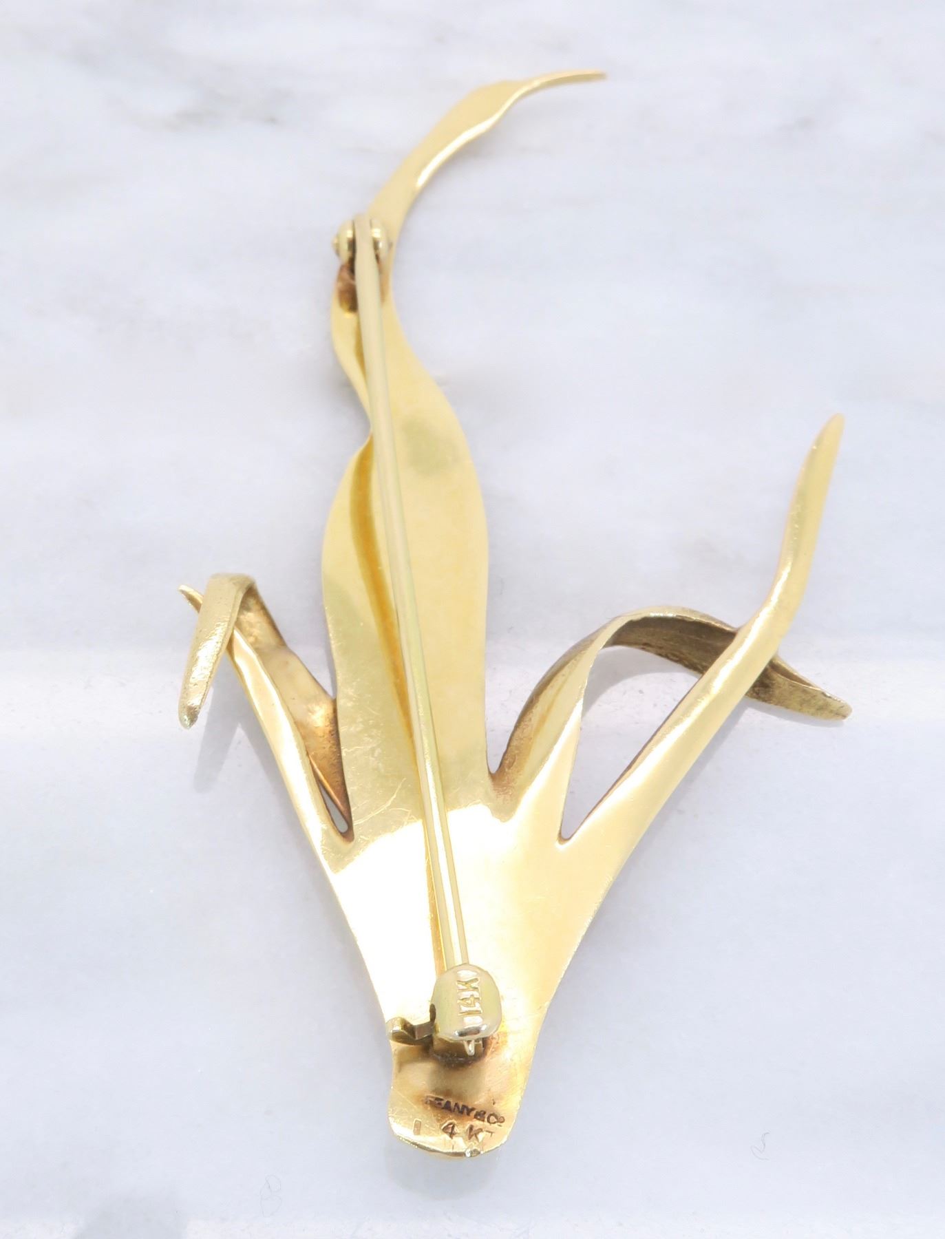 One 14KT yellow gold Crane bird brooch by Tiffany & Co. The beautiful finish and textured feathers accentuate the birds streamlined body. This brooch shows all the signs of an early modern Mid Century piece with Nouveau style by Tiffany & Co. It has the renown quality of Tiffany, and has a safety clasp lock on the pin. A absolutely stunning and authentic piece.