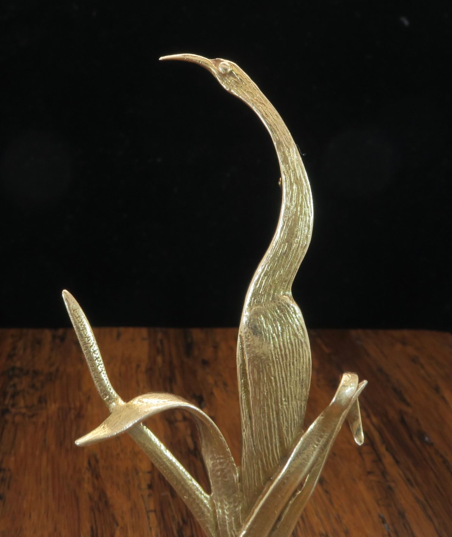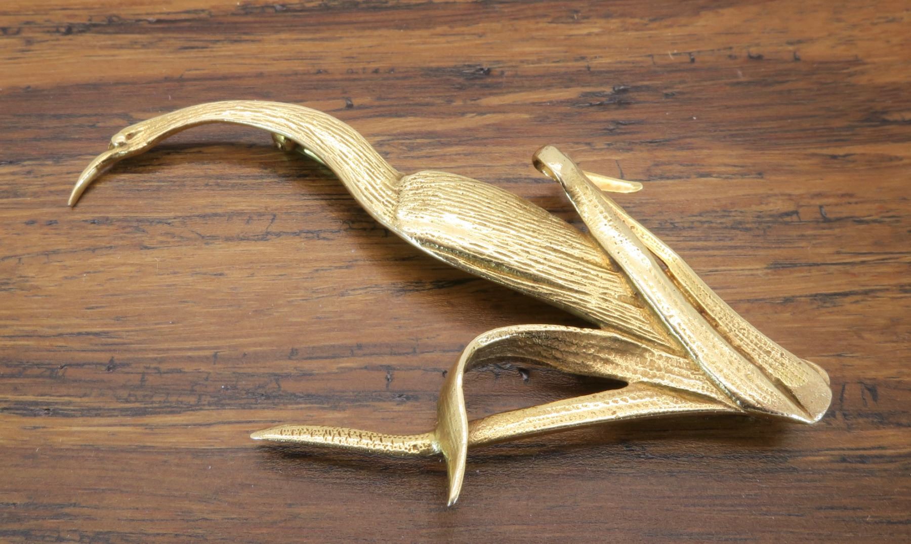 One 14KT yellow gold Crane bird brooch by Tiffany & Co.� The beautiful finish and textured feathers accentuate the birds streamlined body. This brooch shows all the signs of an early modern Mid Century piece with Nouveau style by Tiffany & Co.� It has the renown quality of Tiffany, and has a safety clasp lock on the pin. A absolutely stunning and authentic piece.