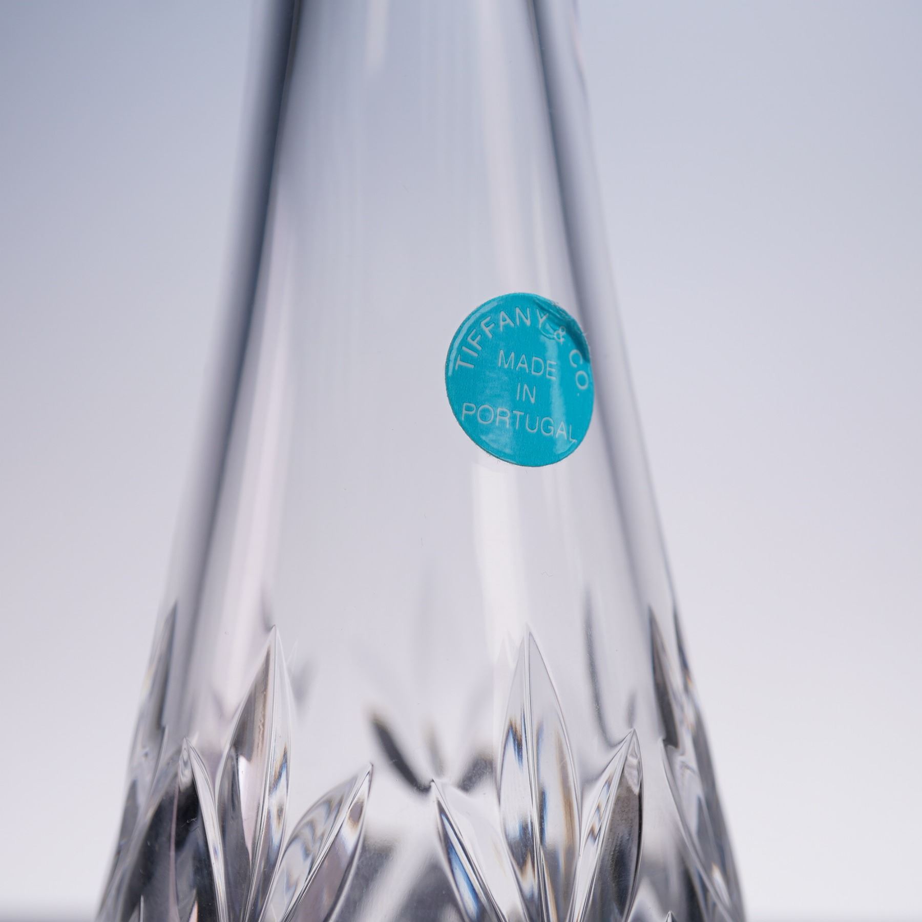 Elegant Tiffany and Co crystal bud vase in the Sybil pattern, featuring a flared neck and intricately cut design with a starburst base. Crafted in Portugal, this fine crystal vase displays exceptional clarity and brilliance, retaining its original Tiffany and Co sticker. Measures 8"H.
