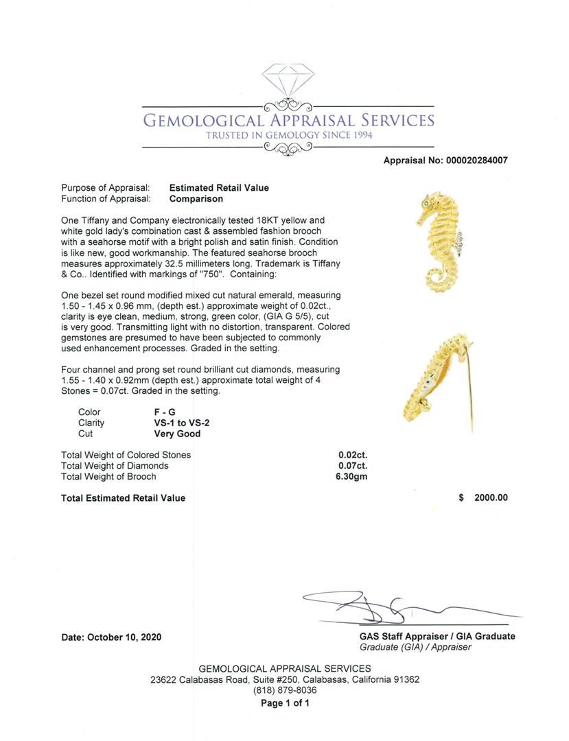 One Tiffany and Company electronically tested 18KT yellow and white gold lady's combination cast & assembled fashion brooch with a seahorse motif with a bright polish and satin finish. Condition is like new, good workmanship. The featured seahorse brooch measures approximately 32.5 millimeters long. Trademark is Tiffany & Co.. Identified with markings of "750". Containing: One bezel set round modified mixed cut natural emerald, measuring 1.50 - 1.45 x 0.96 mm, (depth est.) approximate weight of 0.02ct., clarity is eye clean, medium, strong, green color, (GIA G 5/5), cut is very good. Transmitting light with no distortion, transparent. Colored gemstones are presumed to have been subjected to commonly used enhancement processes. Graded in the setting. Four channel and prong set round brilliant cut diamonds, measuring 1.55 - 1.40 x 0.92mm (depth est.) approximate total weight of 4 Stones = 0.07ct. Graded in the setting. Color Clarity Cut F - G VS-1 to VS-2 Very Good Total Weight of Colored Stones Total Weight of Diamonds Total Weight of Brooch Total Estimated Retail Value 0.02ct. 0.07ct. 6.30gm S 2000.00