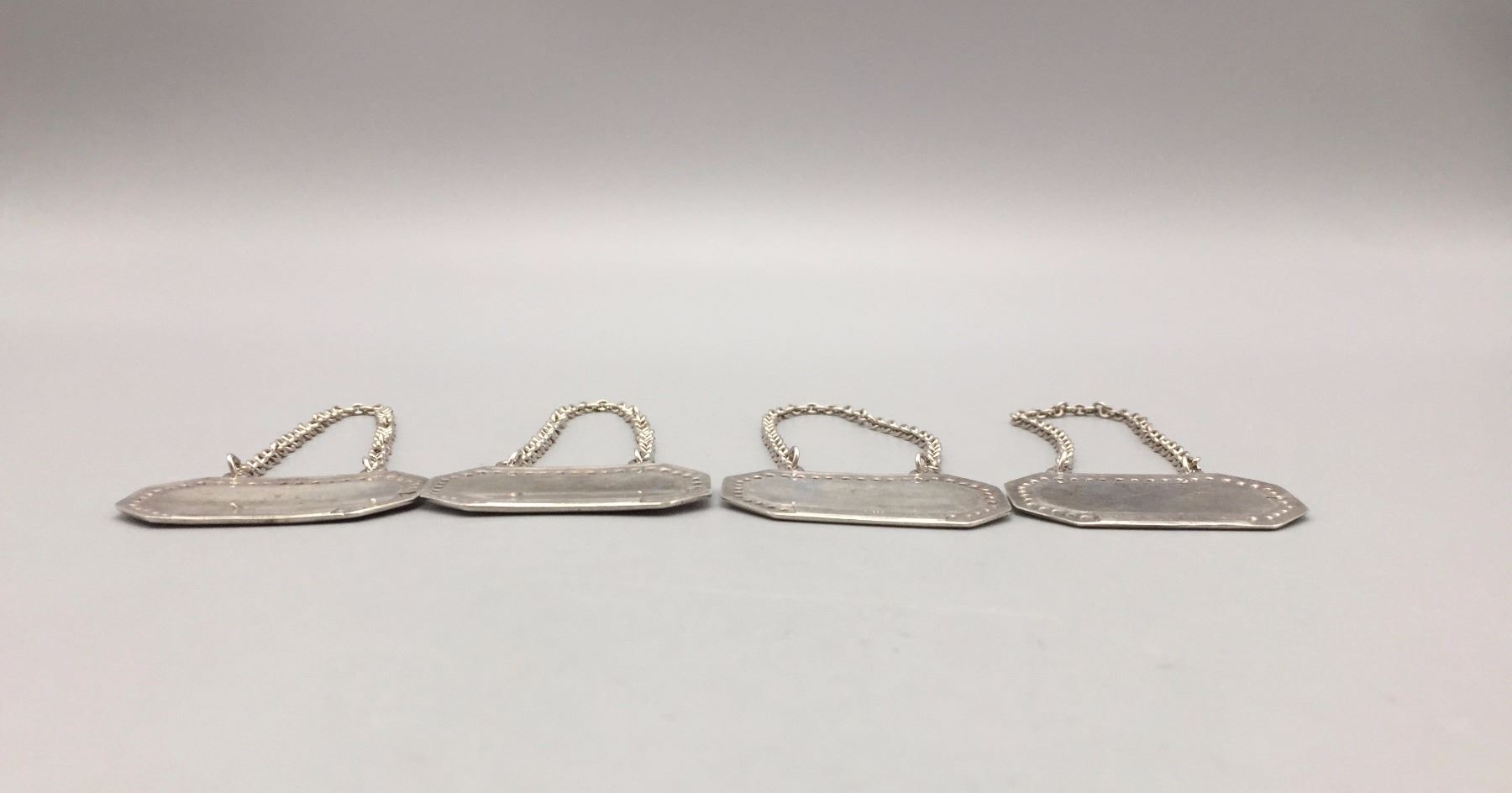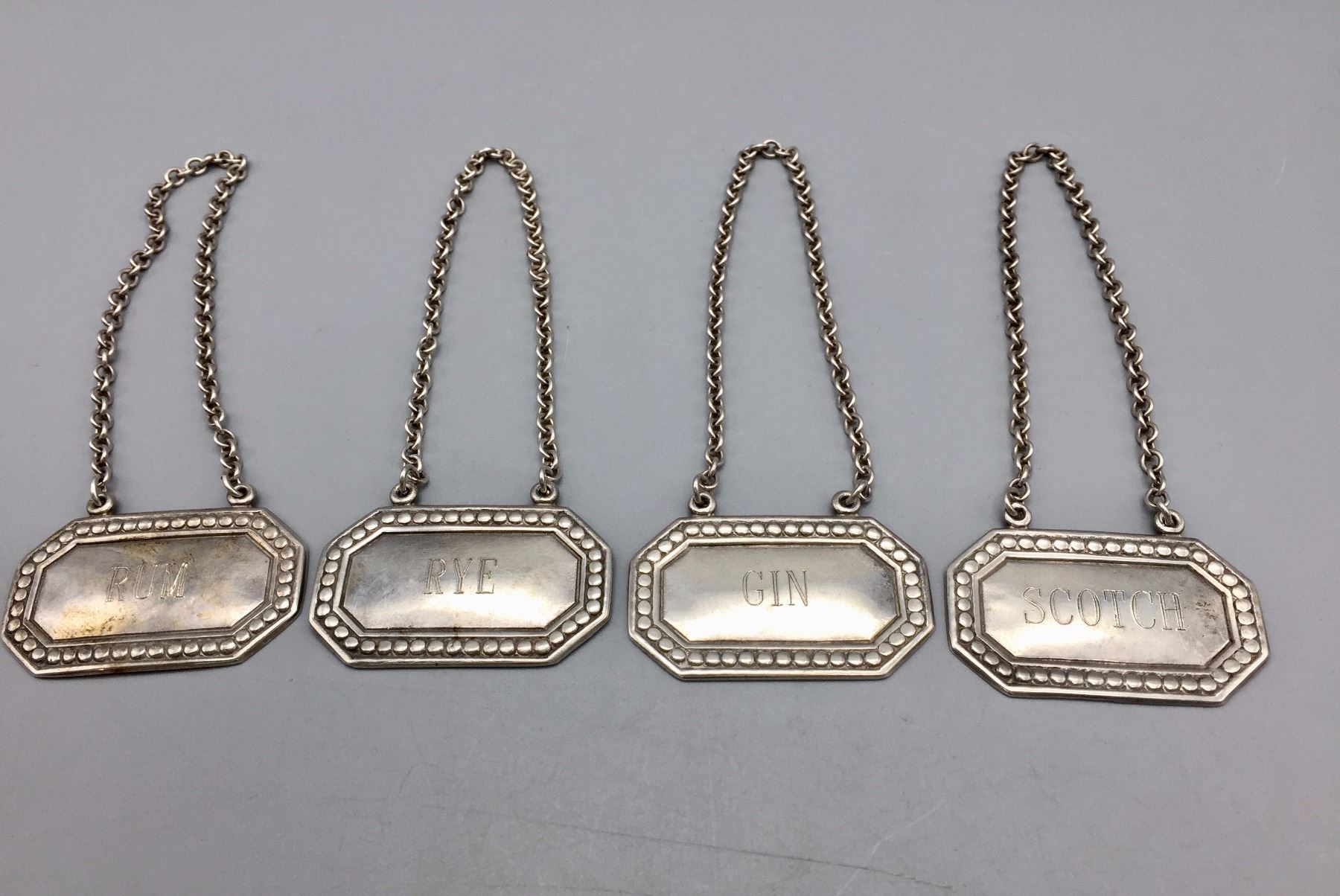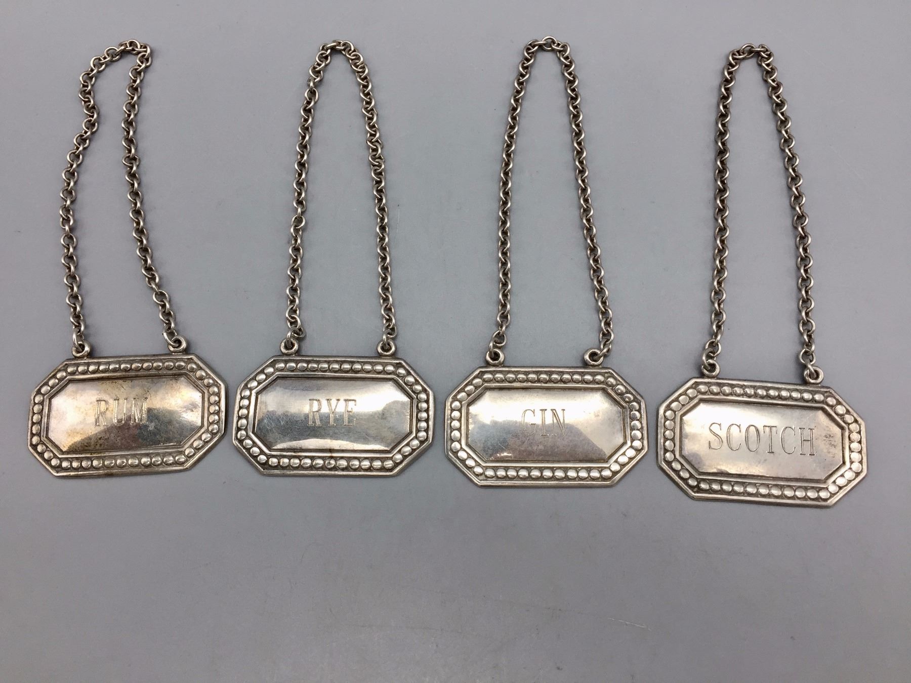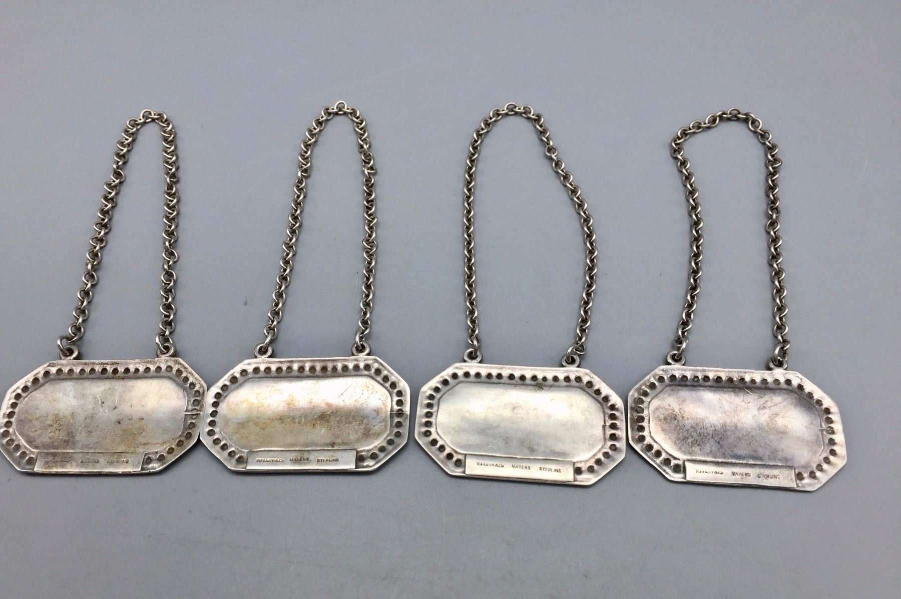 Description: Set of four vintage Tiffany and Co. engraved decanter tags, labeled; scotch, rum, gin, and rye. Maker: Hallmarked, Tiffany and Co. Approx. Age: Vintage. Size: Tags measure 1” w x 1 5/8” l and have a combined weight of 47.8 g. Condition: Good for their age, normal wear expected. Please look closely at the pictures - they are an important part of our description. Shipping: There will be a $5 handling / packaging fee for shipping this lot. The actual cost of postage will be added on top of that.