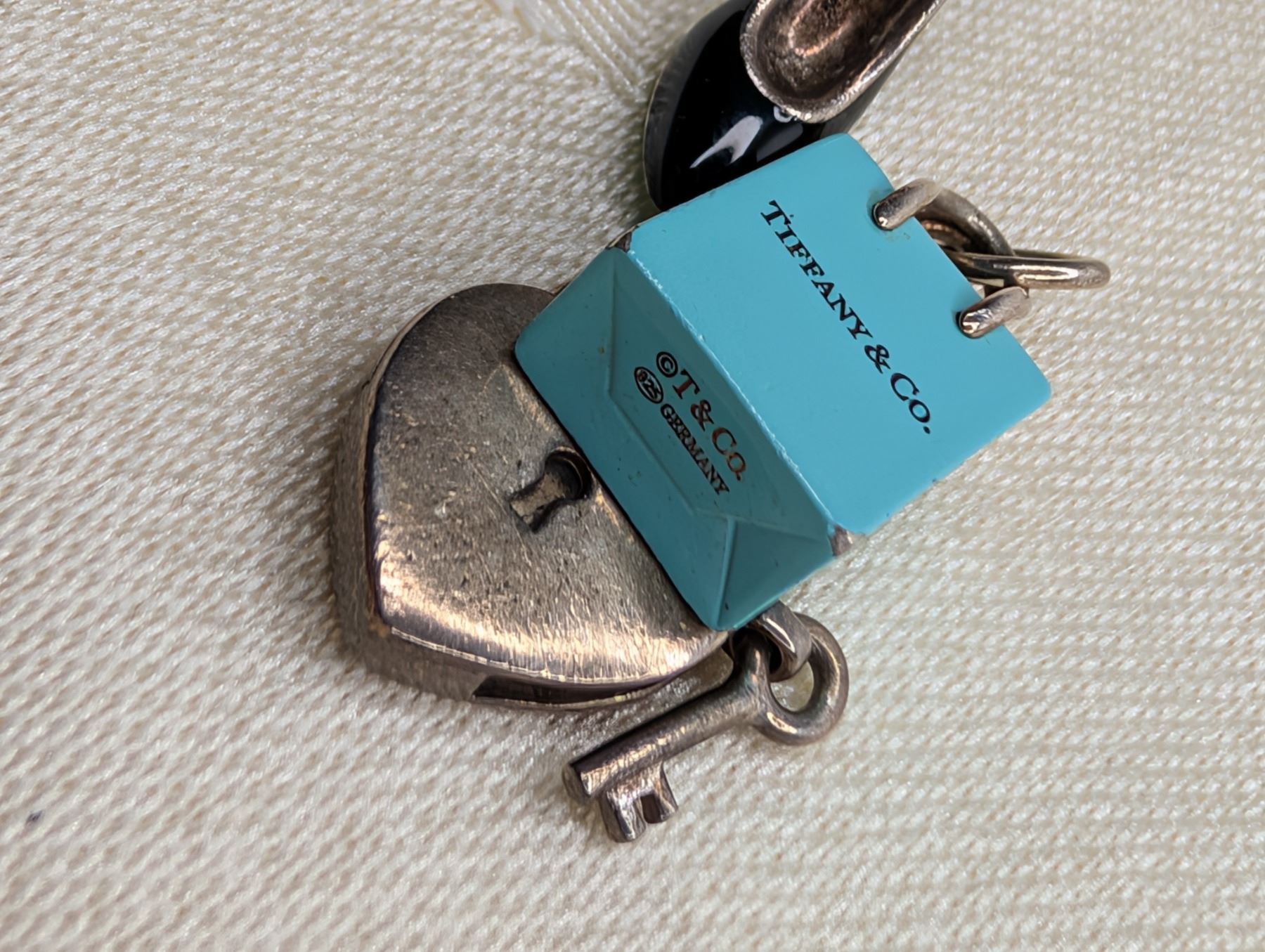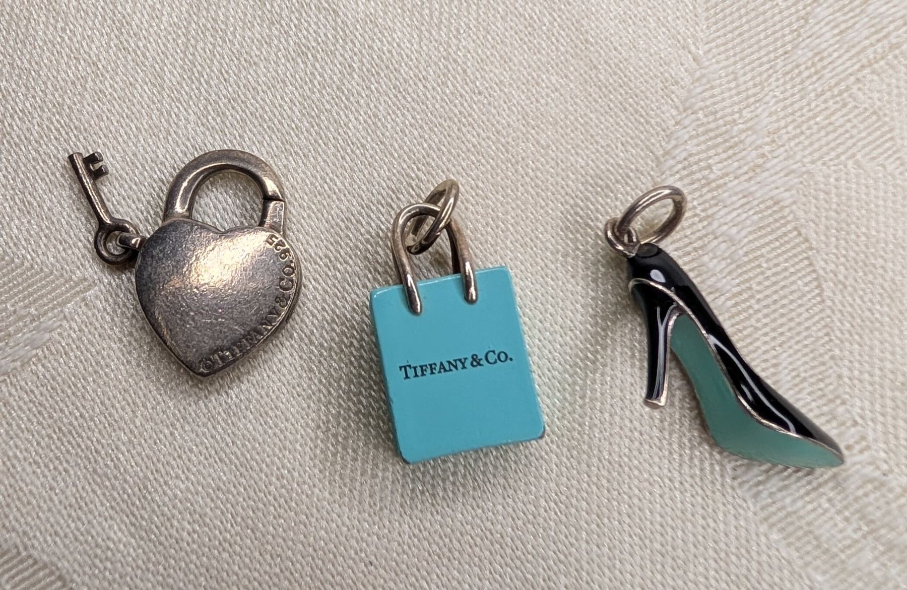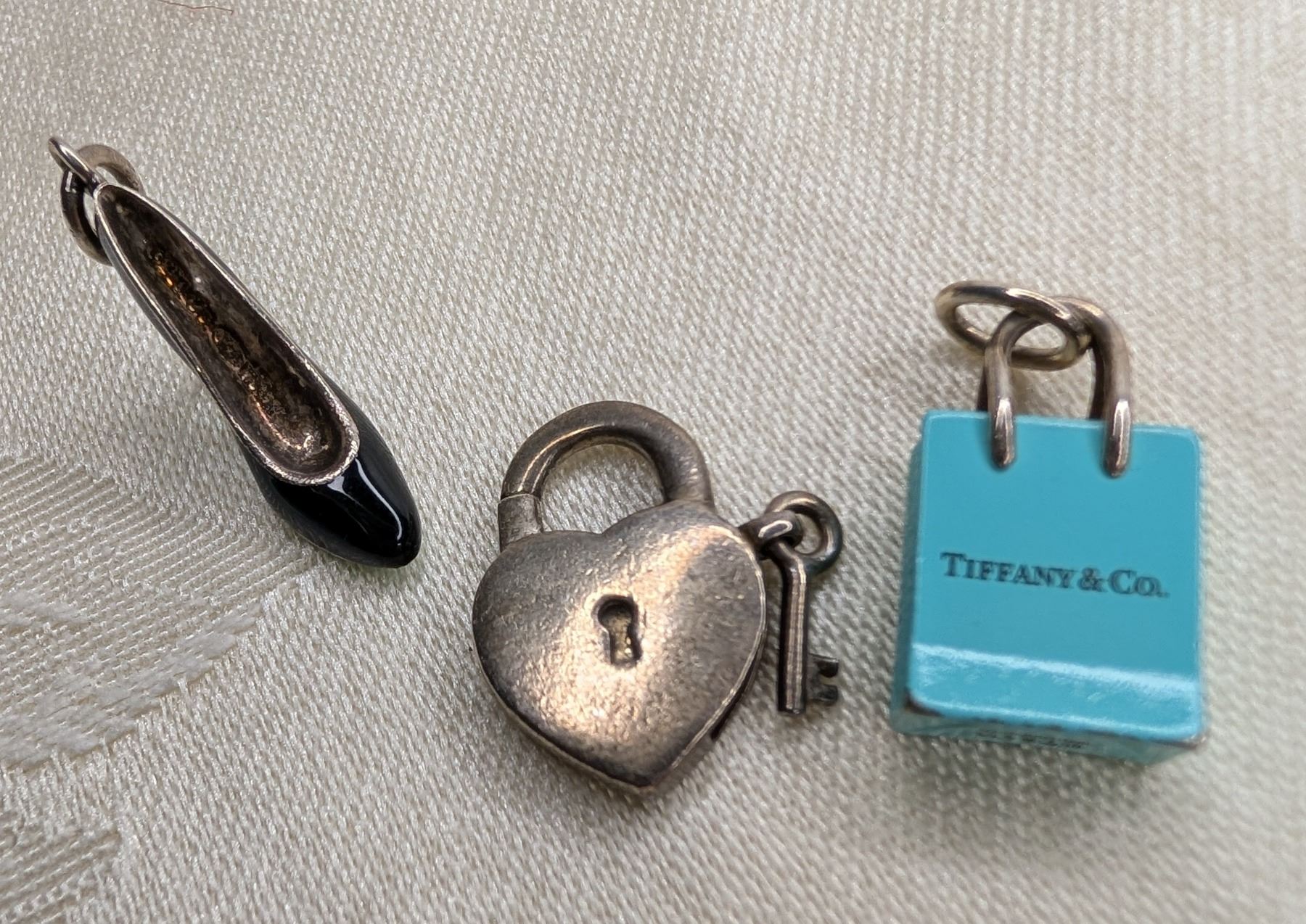 Authentic T&Co. set of three (3) charms - padlock heart w/key, blue enamel shopping bag, black enamel high heel shoe